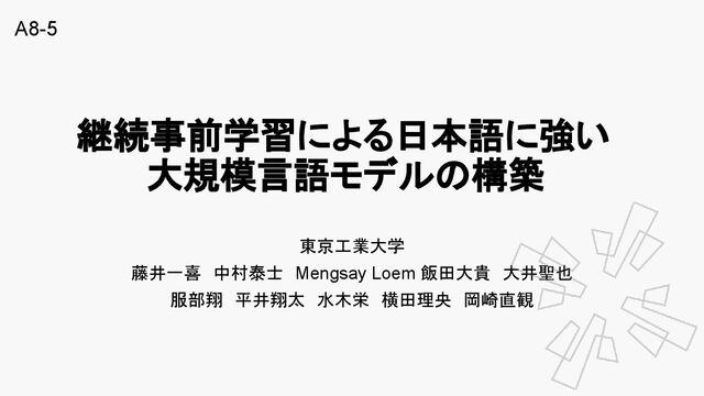 継続事前学習による日本語に強い 大規模言語モデルの構築 東京工業大学 藤井一喜 中村泰士 Mengsay Loem 飯田大貴 大井聖也 服部翔 平井翔太 水木栄 横田理央 岡崎直観 A8-5
