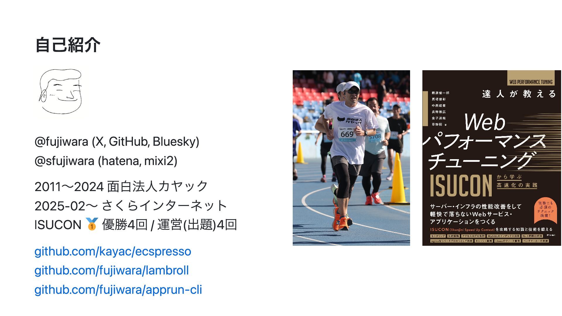 2025-02〜 さくらインターネット ISUCON 優勝4回 / 運営(出題)4回 github.com/kayac/ecspresso github.com/fujiwara/lambroll github.com/fujiwara/apprun-cli