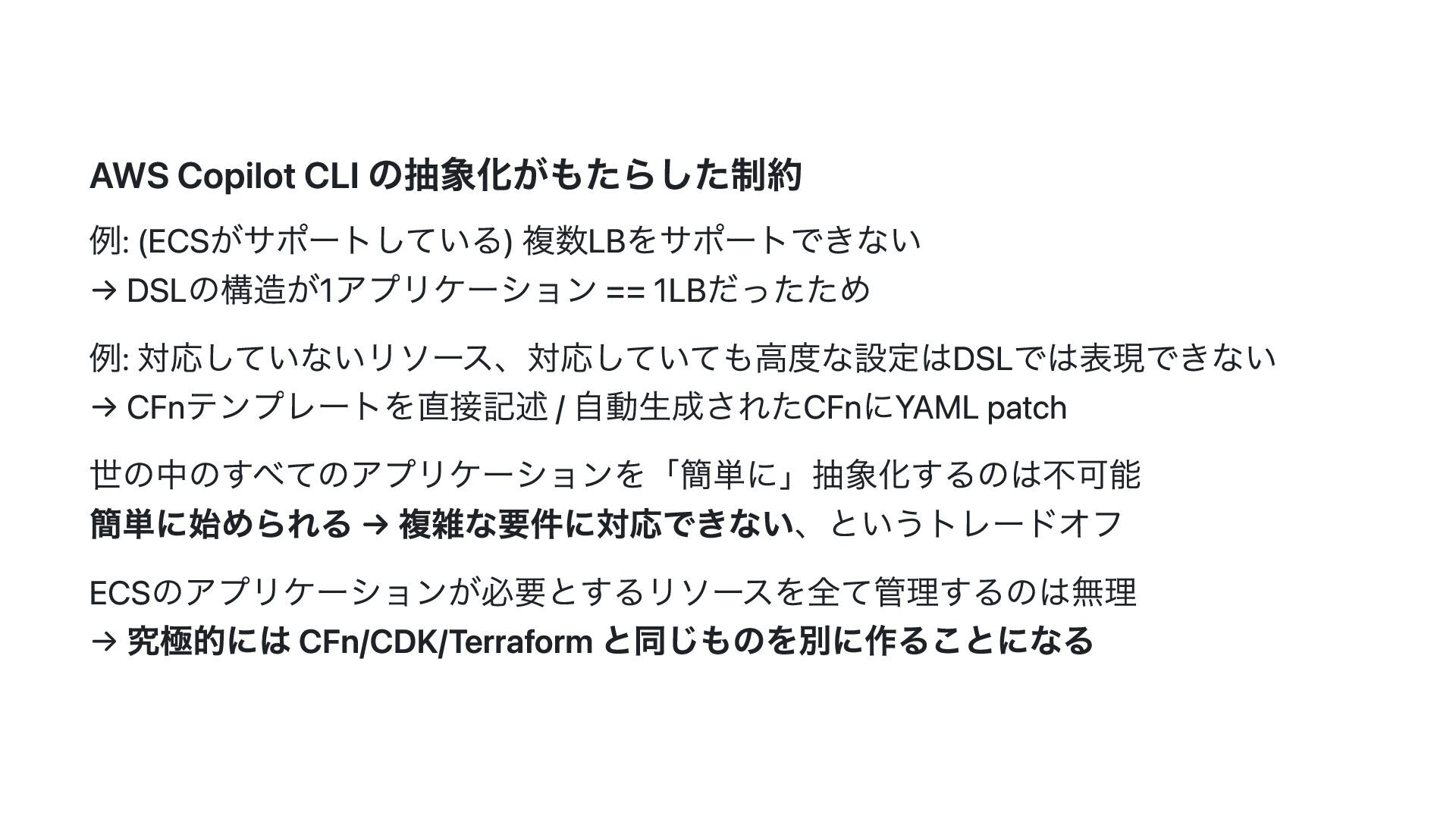 1LBだったため 例: 対応していないリソース、対応していても高度な設定はDSLでは表現できない → CFnテンプレートを直接記述 / 自動生成されたCFnにYAML patch 世の中のすべてのアプリケーションを「簡単に」抽象化するのは不可能 簡単に始められる → 複雑な要件に対応できない、というトレードオフ ECSのアプリケーションが必要とするリソースを全て管理するのは無理 → 究極的には CFn/CDK/Terraform と同じものを別に作ることになる