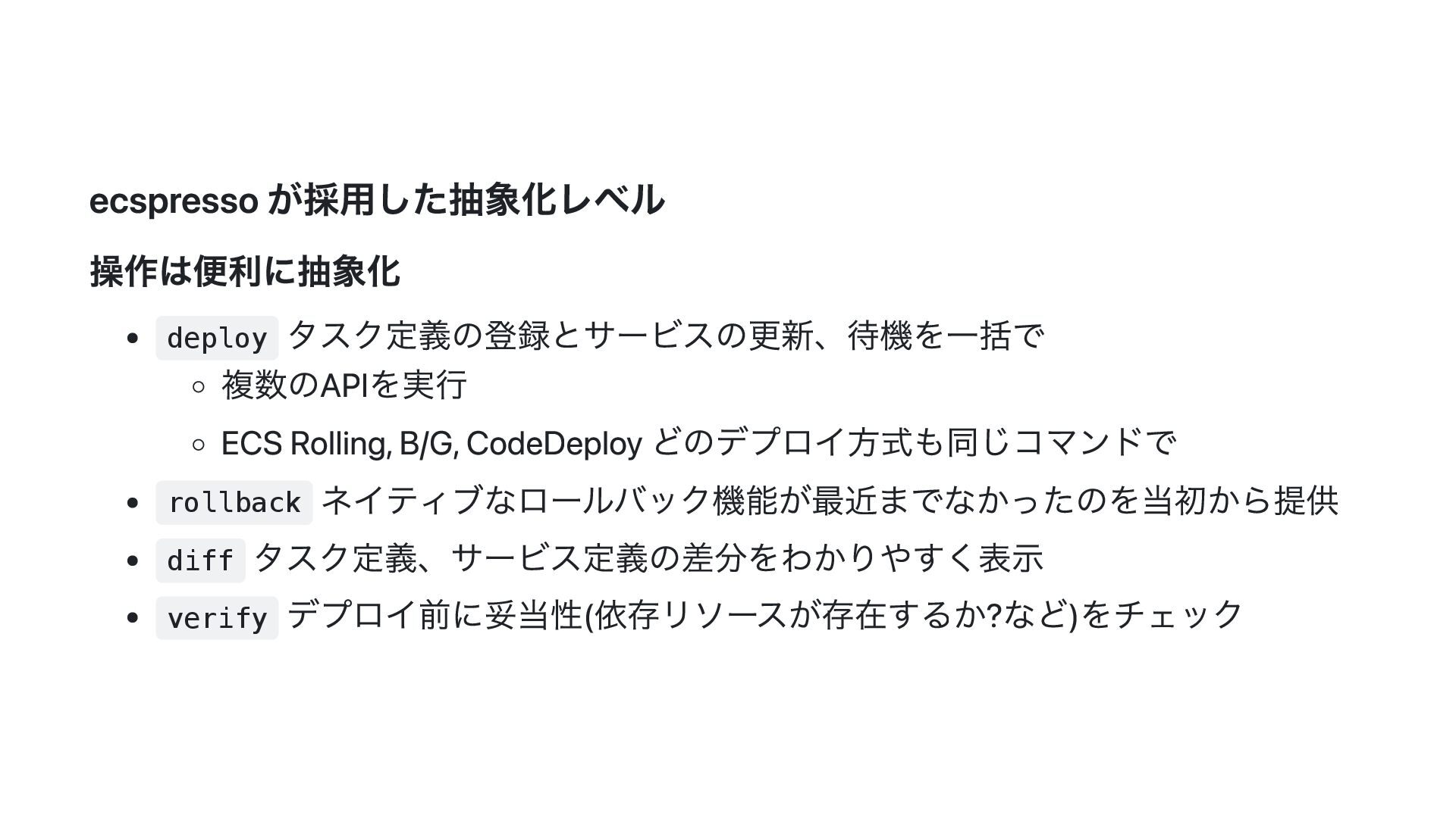 ecspresso が採用した抽象化レベル 操作は便利に抽象化 deploy タスク定義の登録とサービスの更新、待機を一括で 複数のAPIを実行 ECS Rolling, B/G, CodeDeploy
