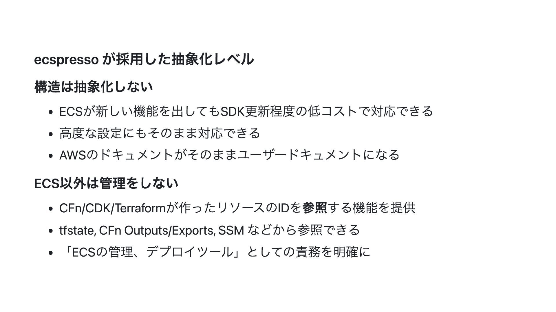 ecspresso が採用した抽象化レベル 構造は抽象化しない ECSが新しい機能を出してもSDK更新程度の低コストで対応できる 高度な設定にもそのまま対応できる AWSのドキュメントがそのままユーザードキュメントになる ECS以外は管理をしない CFn/CDK/Terraformが作ったリソースのIDを参照する機能を提供 tfstate, CFn