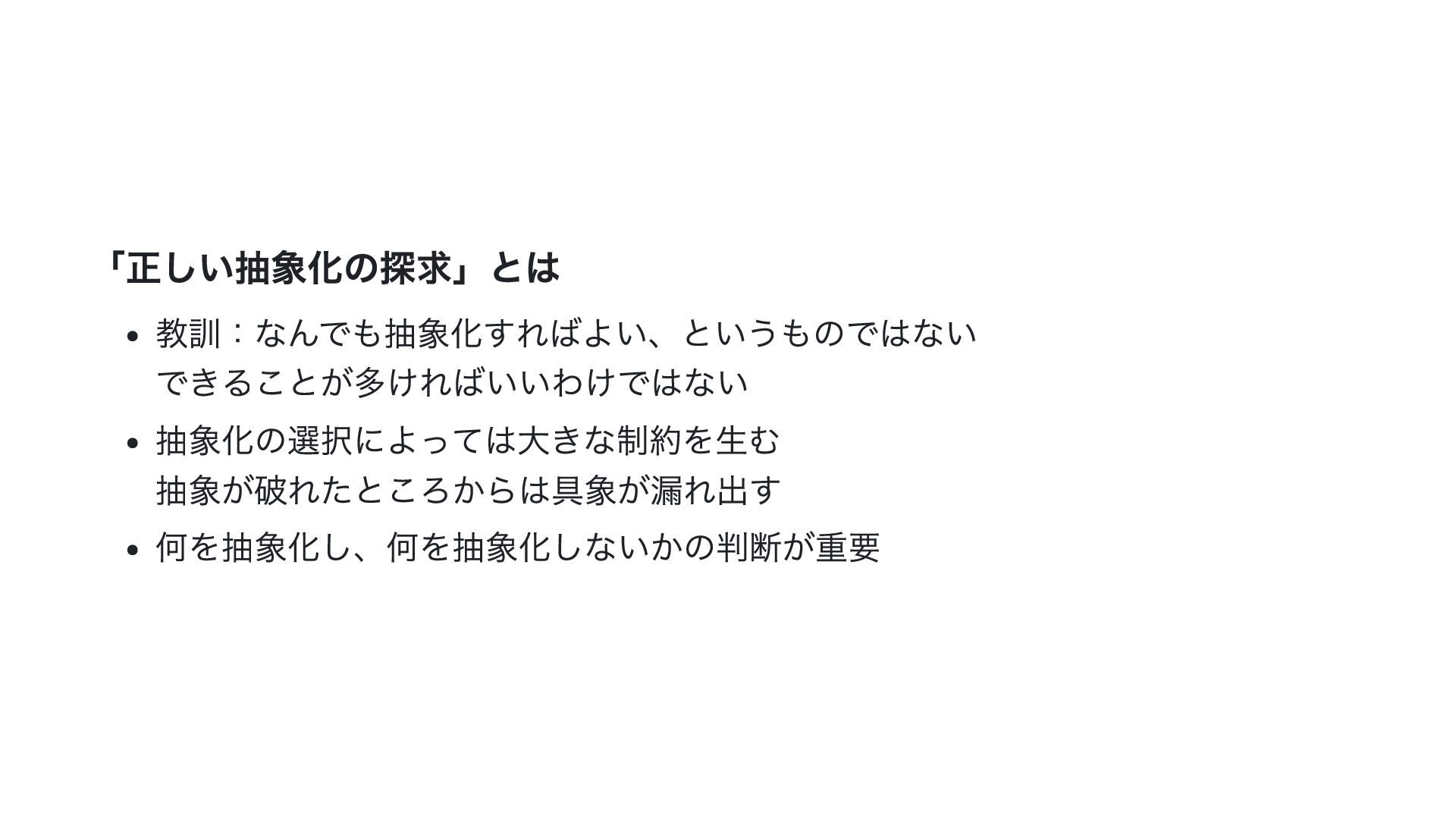 「正しい抽象化の探求」とは 教訓:なんでも抽象化すればよい、というものではない できることが多ければいいわけではない 抽象化の選択によっては大きな制約を生む 抽象が破れたところからは具象が漏れ出す 何を抽象化し、何を抽象化しないかの判断が重要