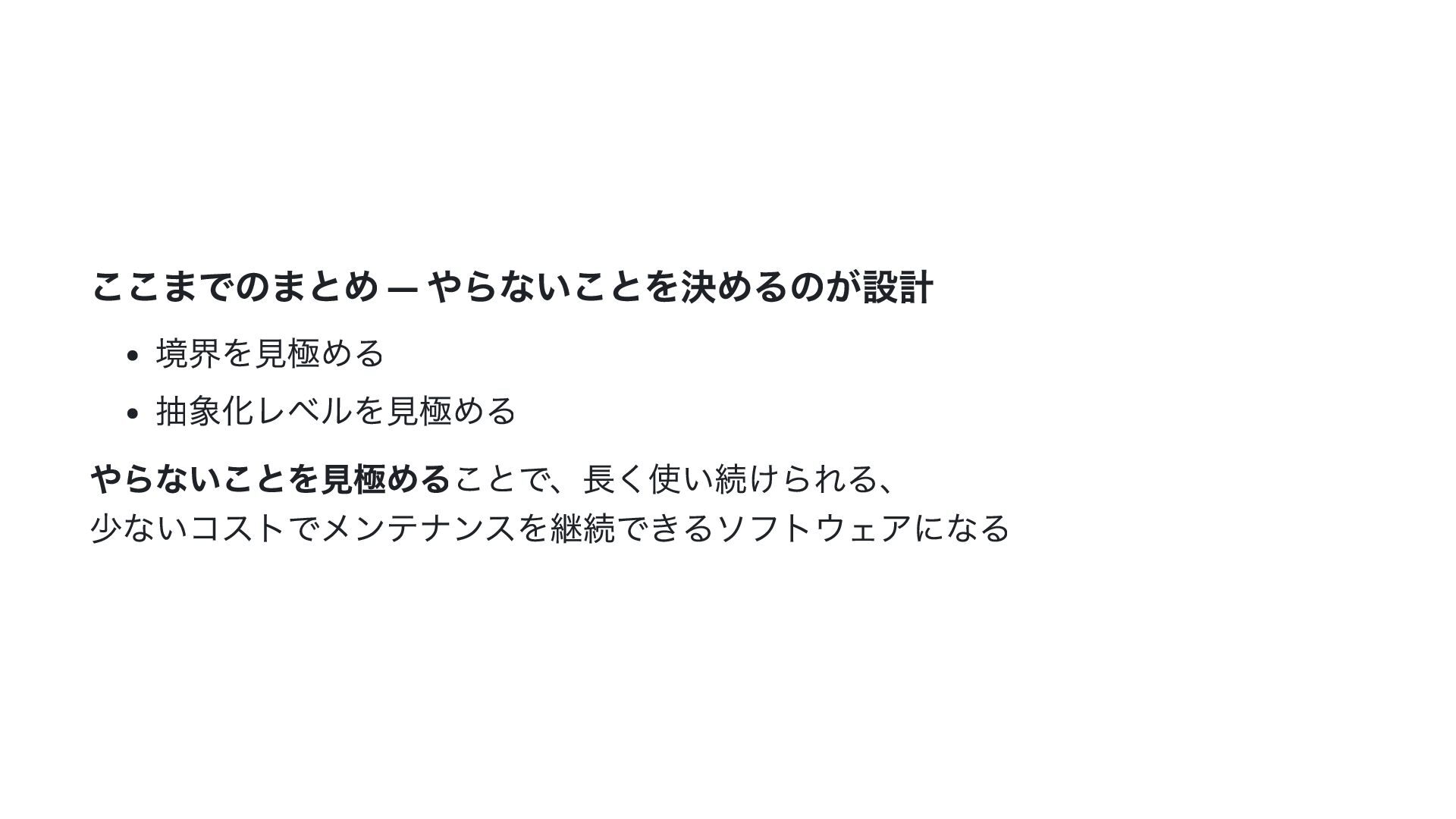 ここまでのまとめ — やらないことを決めるのが設計 境界を見極める 抽象化レベルを見極める やらないことを見極めることで、長く使い続けられる、 少ないコストでメンテナンスを継続できるソフトウェアになる