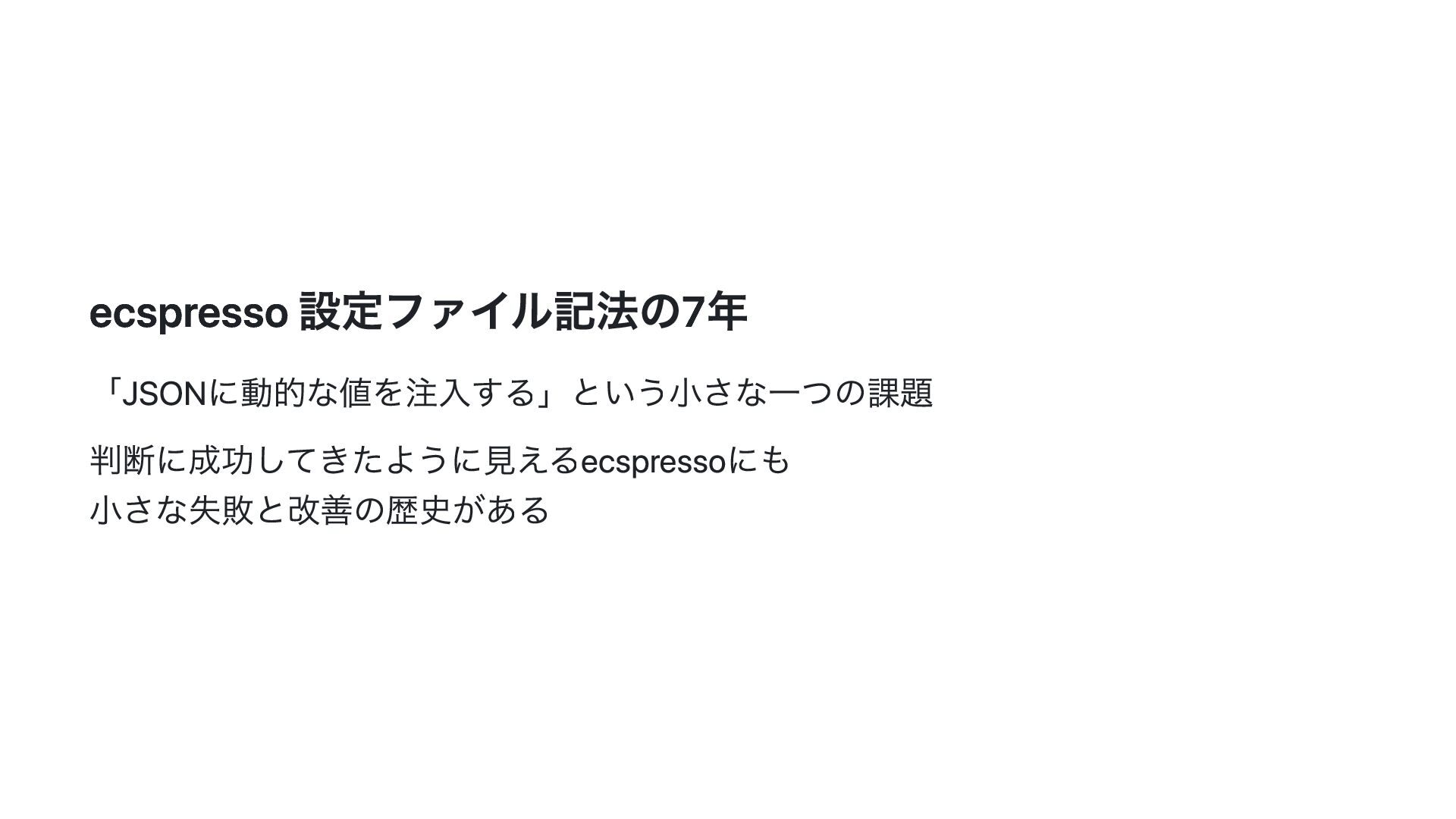 ecspresso 設定ファイル記法の7年 「JSONに動的な値を注入する」という小さな一つの課題 判断に成功してきたように見えるecspressoにも 小さな失敗と改善の歴史がある