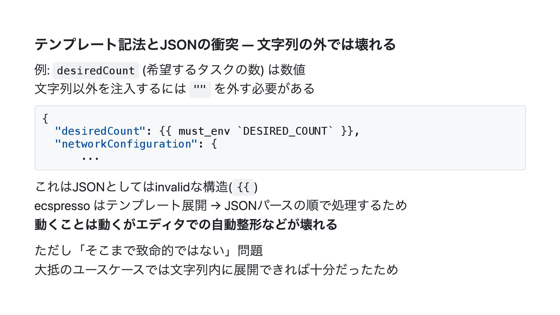 { "desiredCount": {{ must_env `DESIRED_COUNT` }}, "networkConfiguration": { ... これはJSONとしてはinvalidな構造( {{ ) ecspresso はテンプレート展開 → JSONパースの順で処理するため 動くことは動くがエディタでの自動整形などが壊れる ただし「そこまで致命的ではない」問題 大抵のユースケースでは文字列内に展開できれば十分だったため