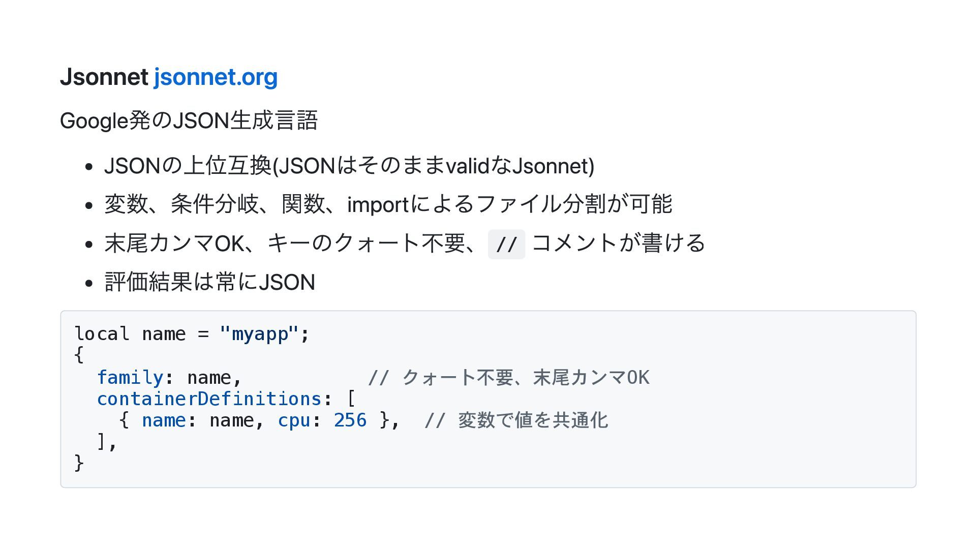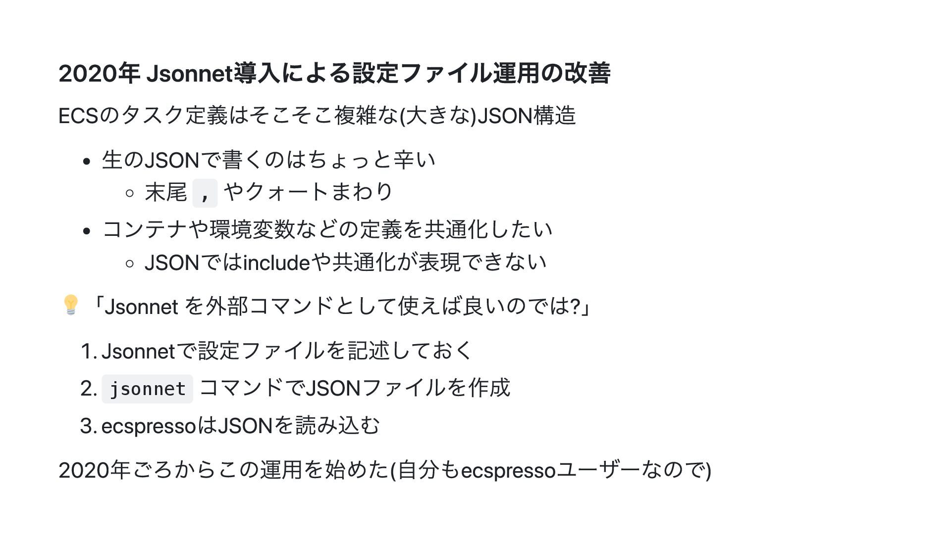 を外部コマンドとして使えば良いのでは?」 1. Jsonnetで設定ファイルを記述しておく 2. jsonnet コマンドでJSONファイルを作成 3. ecspressoはJSONを読み込む 2020年ごろからこの運用を始めた(自分もecspressoユーザーなので)