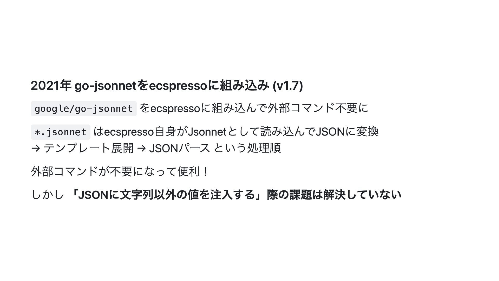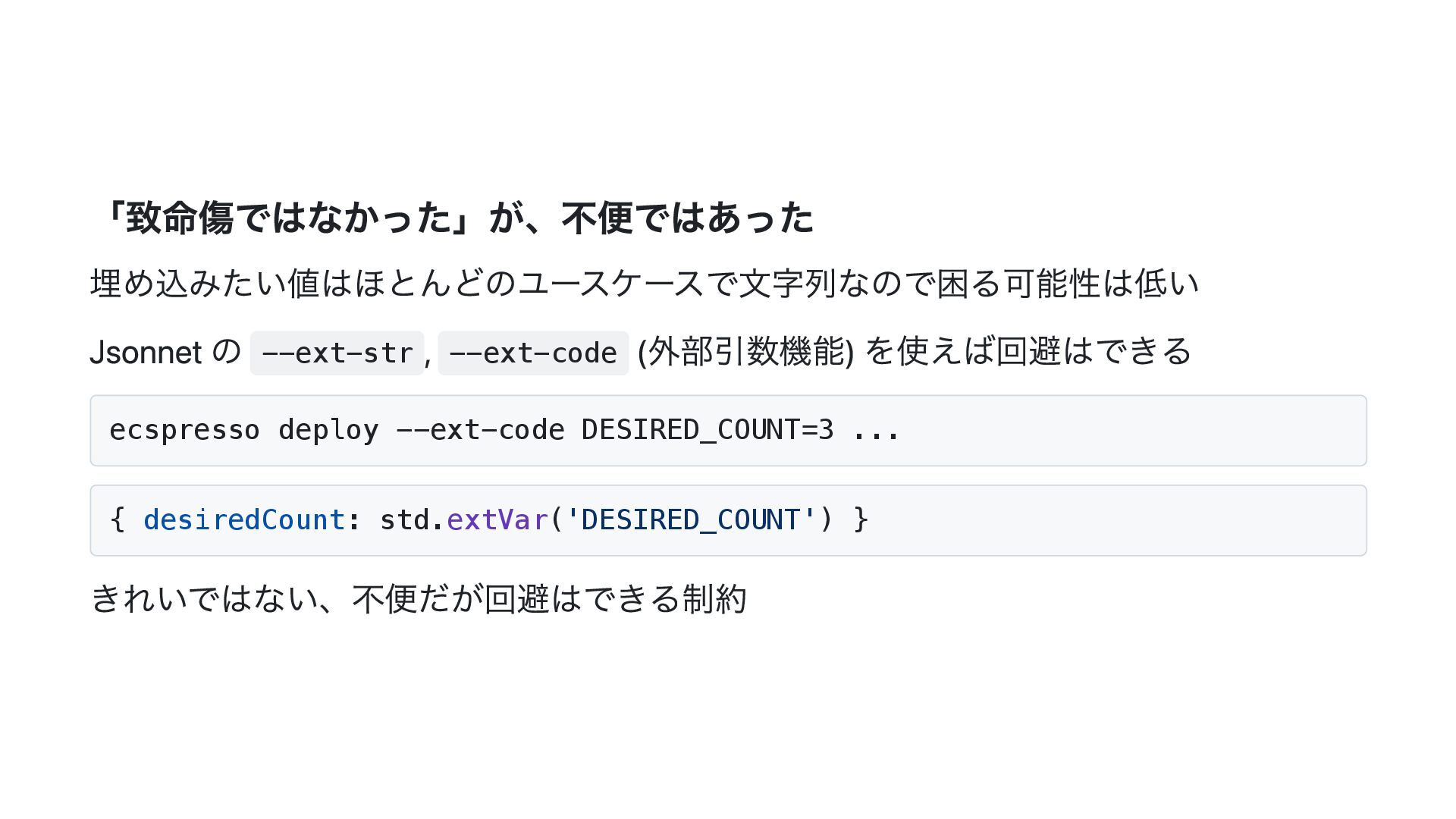 「致命傷ではなかった」が、不便ではあった 埋め込みたい値はほとんどのユースケースで文字列なので困る可能性は低い Jsonnet の --ext-str , --ext-code (外部引数機能) を使えば回避はできる ecspresso