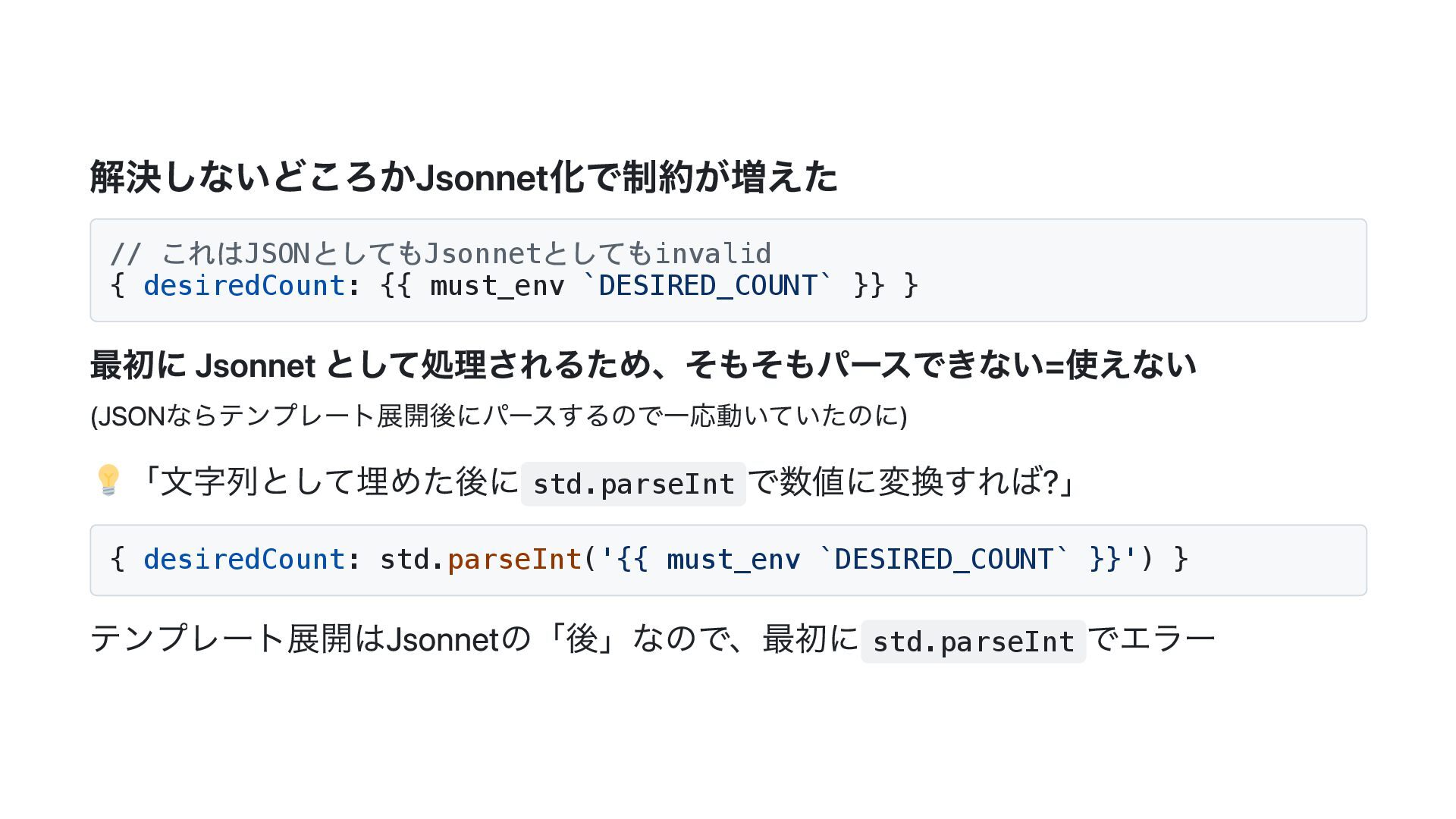 最初に Jsonnet として処理されるため、そもそもパースできない=使えない (JSONならテンプレート展開後にパースするので一応動いていたのに) 「文字列として埋めた後に std.parseInt で数値に変換すれば?」 { desiredCount: std.parseInt('{{ must_env `DESIRED_COUNT` }}') } テンプレート展開はJsonnetの「後」なので、最初に std.parseInt でエラー