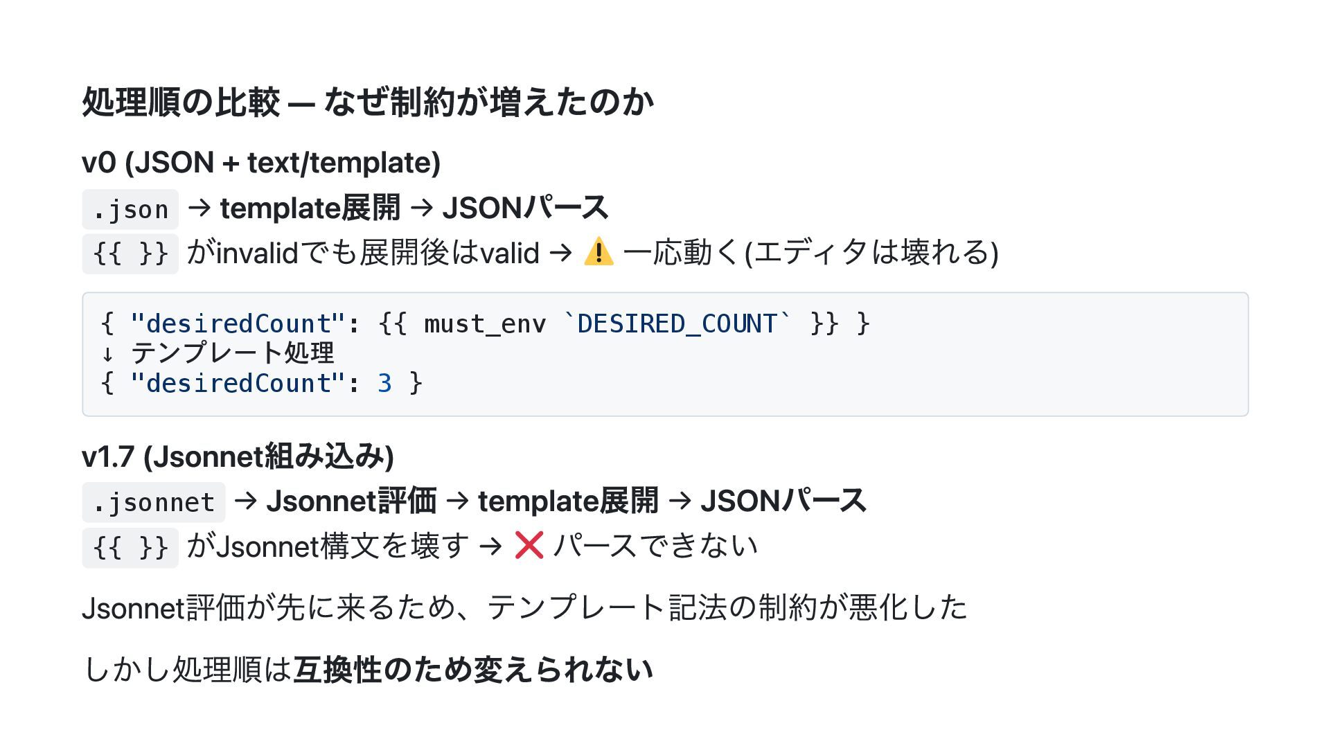 → JSONパース {{ }} がinvalidでも展開後はvalid → 一応動く(エディタは壊れる) { "desiredCount": {{ must_env `DESIRED_COUNT` }} } ↓ テンプレート処理 { "desiredCount": 3 } v1.7 (Jsonnet組み込み) .jsonnet → Jsonnet評価 → template展開 → JSONパース {{ }} がJsonnet構文を壊す → パースできない Jsonnet評価が先に来るため、テンプレート記法の制約が悪化した しかし処理順は互換性のため変えられない