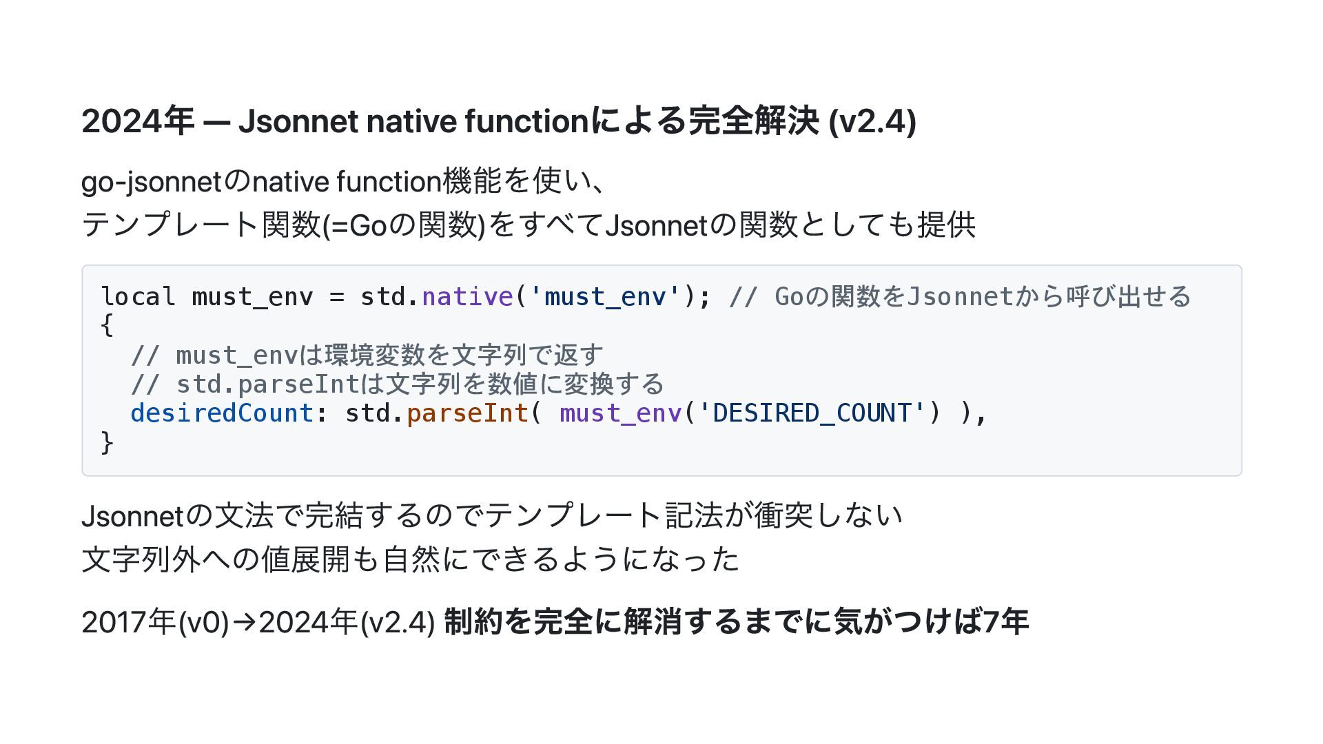 must_env = std.native('must_env'); // Goの関数をJsonnetから呼び出せる { // must_envは環境変数を文字列で返す // std.parseIntは文字列を数値に変換する desiredCount: std.parseInt( must_env('DESIRED_COUNT') ), } Jsonnetの文法で完結するのでテンプレート記法が衝突しない 文字列外への値展開も自然にできるようになった 2017年(v0)→2024年(v2.4) 制約を完全に解消するまでに気がつけば7年