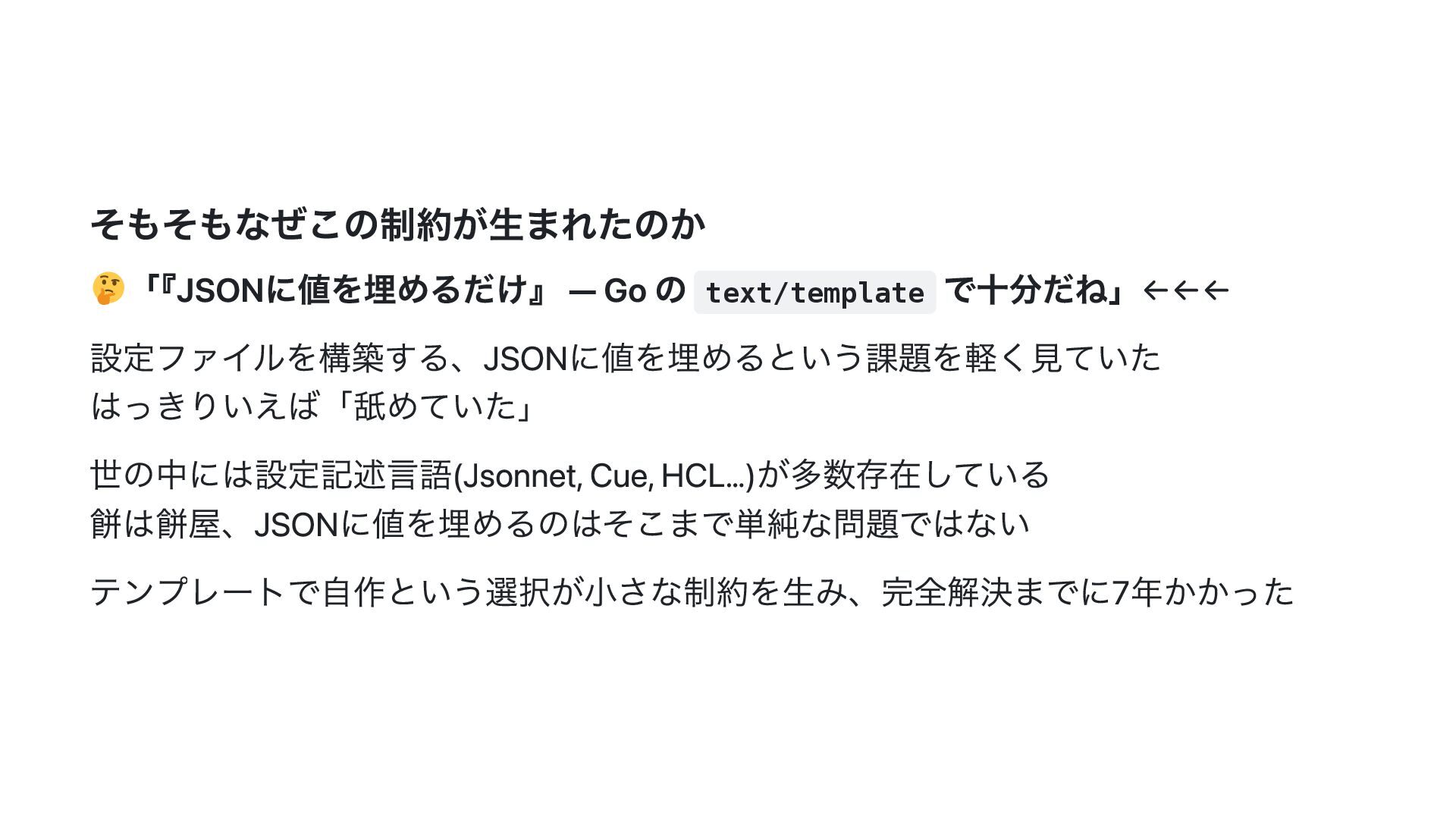 そもそもなぜこの制約が生まれたのか 「 『JSONに値を埋めるだけ』 — Go の text/template で十分だね」←←← 設定ファイルを構築する、JSONに値を埋めるという課題を軽く見ていた はっきりいえば「舐めていた」