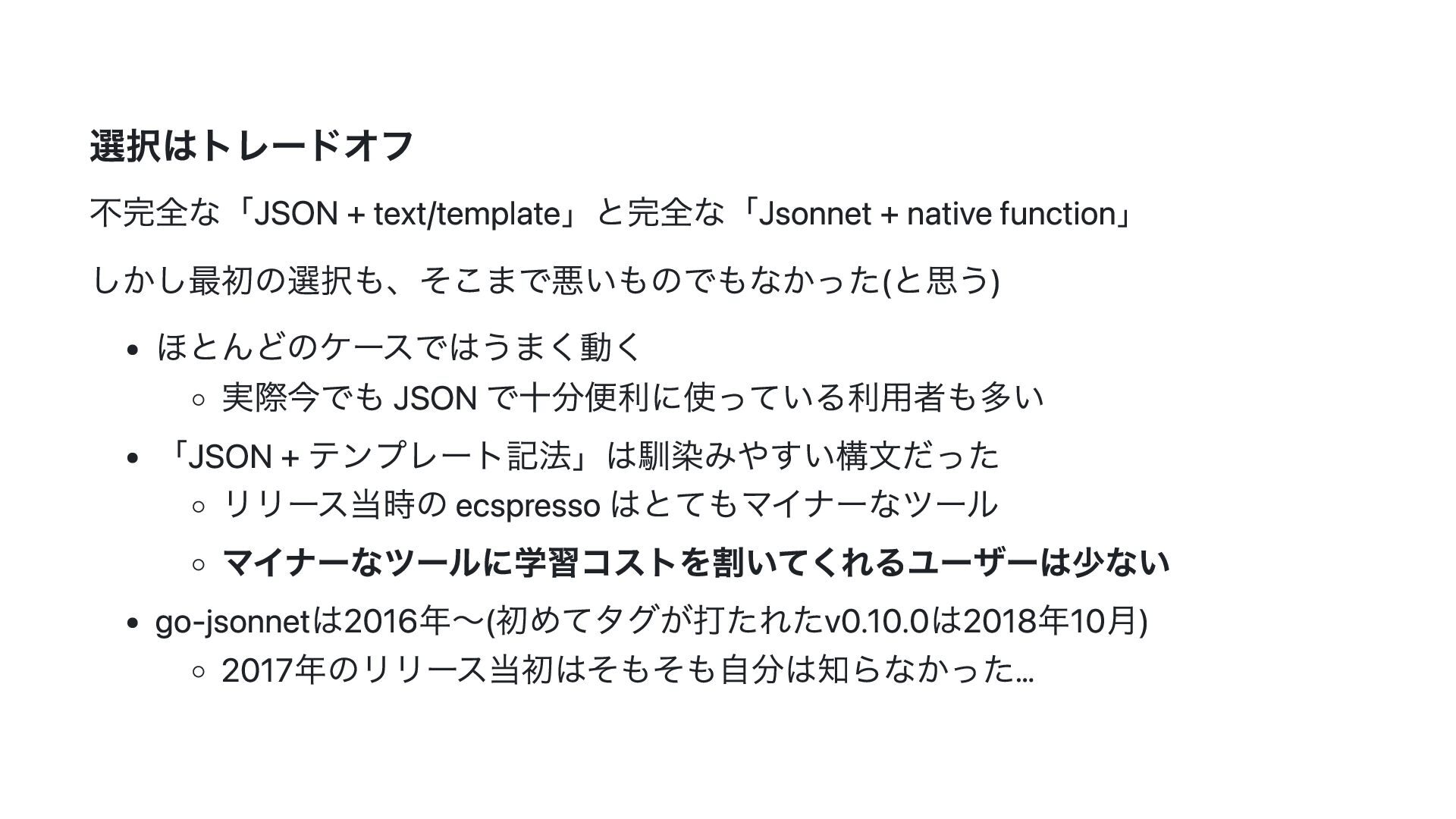 選択はトレードオフ 不完全な「JSON + text/template」と完全な「Jsonnet + native function」 しかし最初の選択も、そこまで悪いものでもなかった(と思う) ほとんどのケースではうまく動く 実際今でも