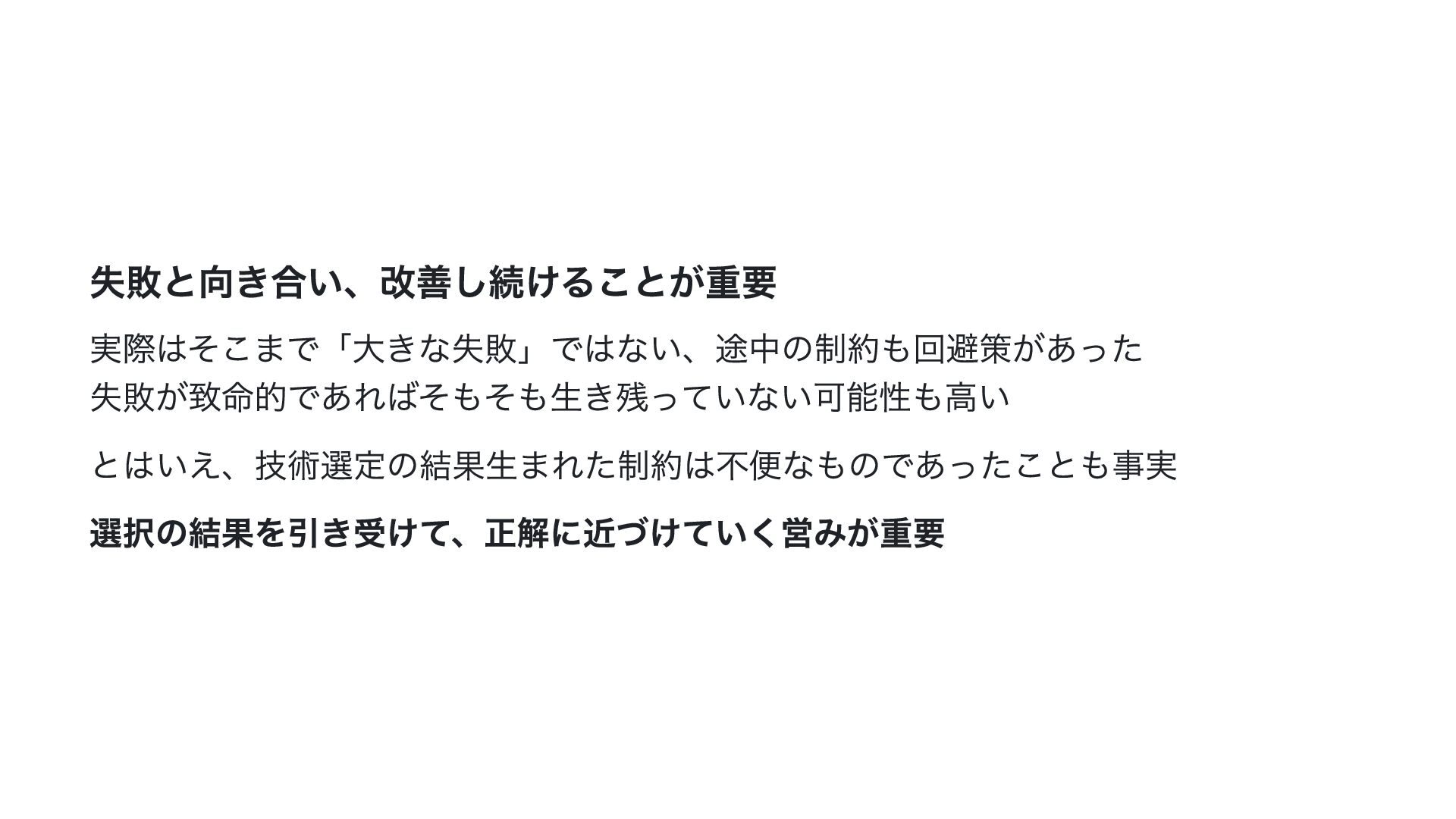失敗と向き合い、改善し続けることが重要 実際はそこまで「大きな失敗」ではない、途中の制約も回避策があった 失敗が致命的であればそもそも生き残っていない可能性も高い とはいえ、技術選定の結果生まれた制約は不便なものであったことも事実 選択の結果を引き受けて、正解に近づけていく営みが重要