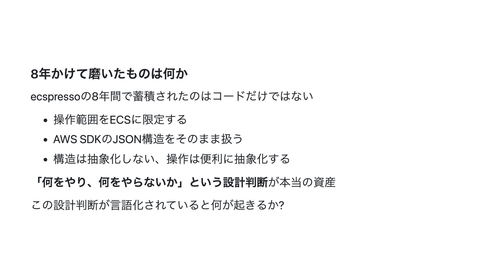 8年かけて磨いたものは何か ecspressoの8年間で蓄積されたのはコードだけではない 操作範囲をECSに限定する AWS SDKのJSON構造をそのまま扱う 構造は抽象化しない、操作は便利に抽象化する 「何をやり、何をやらないか」という設計判断が本当の資産 この設計判断が言語化されていると何が起きるか?