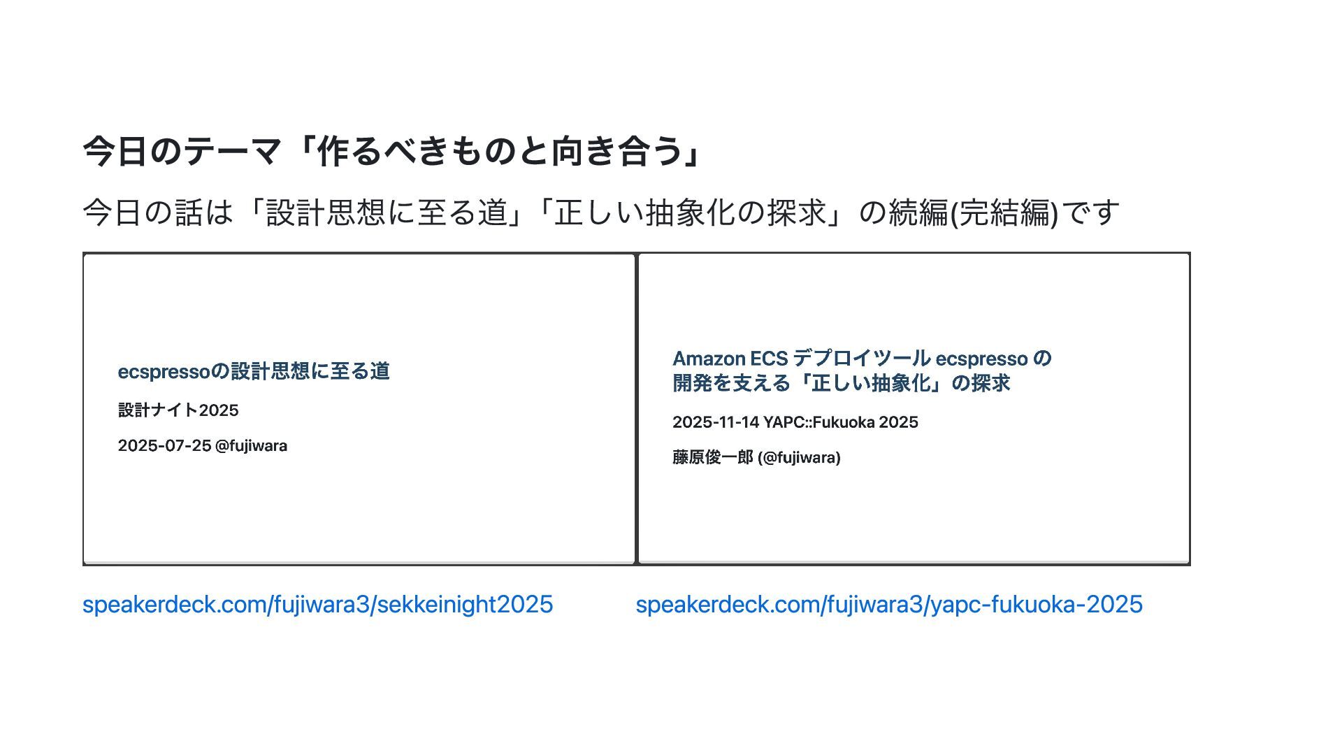 今日のテーマ「作るべきものと向き合う」 今日の話は「設計思想に至る道」 「正しい抽象化の探求」の続編(完結編)です speakerdeck.com/fujiwara3/sekkeinight2025 speakerdeck.com/fujiwara3/yapc-fukuoka-2025
