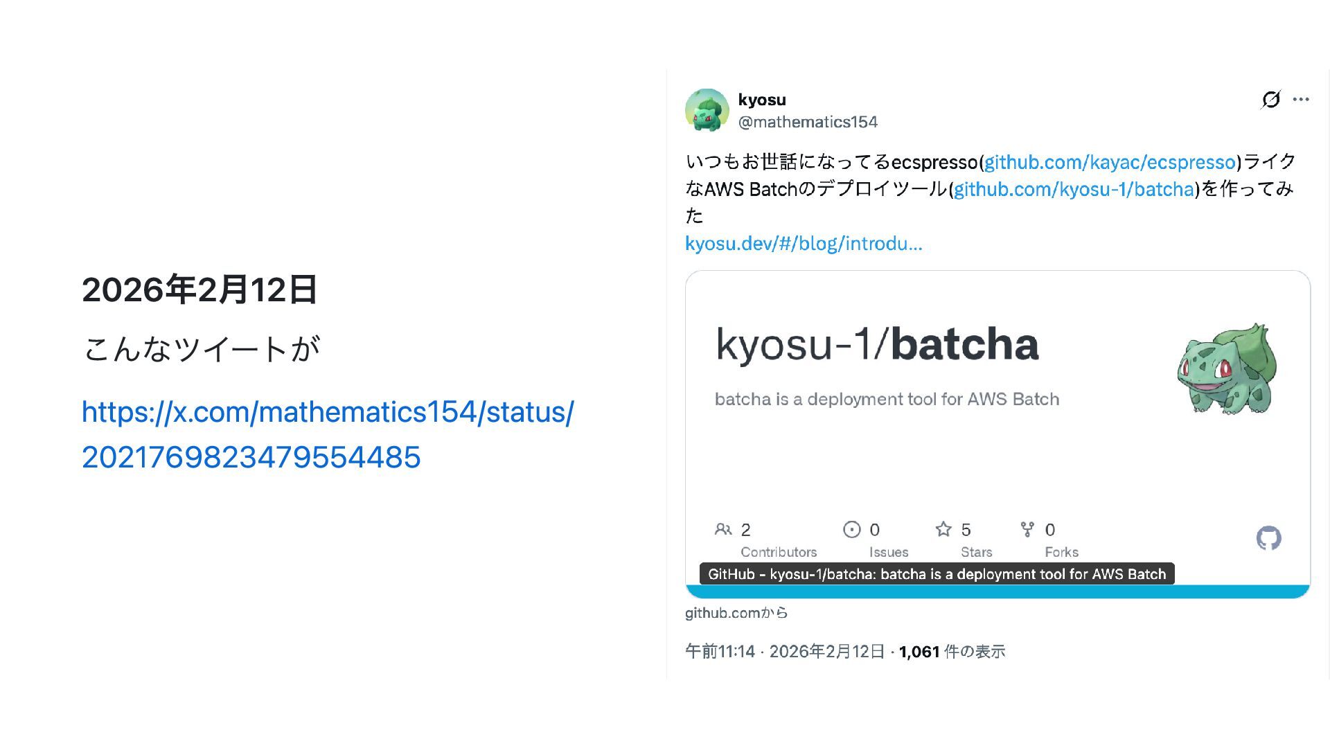 batchaはClaude Codeが(ほぼ)実装した batcha のコードはほぼ Claude Code が書いたもので、自分は設計の方向付けと調 整に徹しました。ecspresso という優れた手本があったのも大きいですが、こう いうツールがサクッと作れてしまう、いい時代になりましたね。