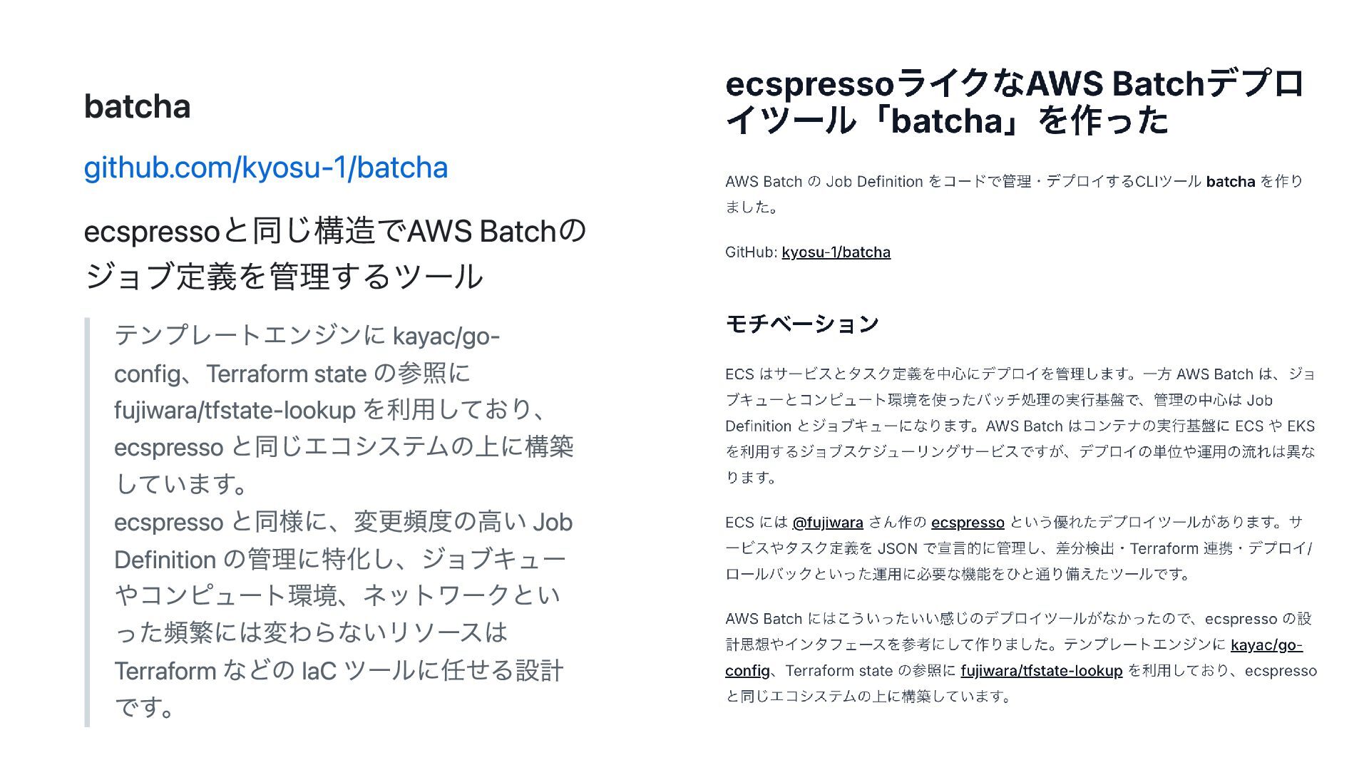 batcha github.com/kyosu-1/batcha ecspressoと同じ構造でAWS Batchの ジョブ定義を管理するツール テンプレートエンジンに kayac/go- config、Terraform state の参照に