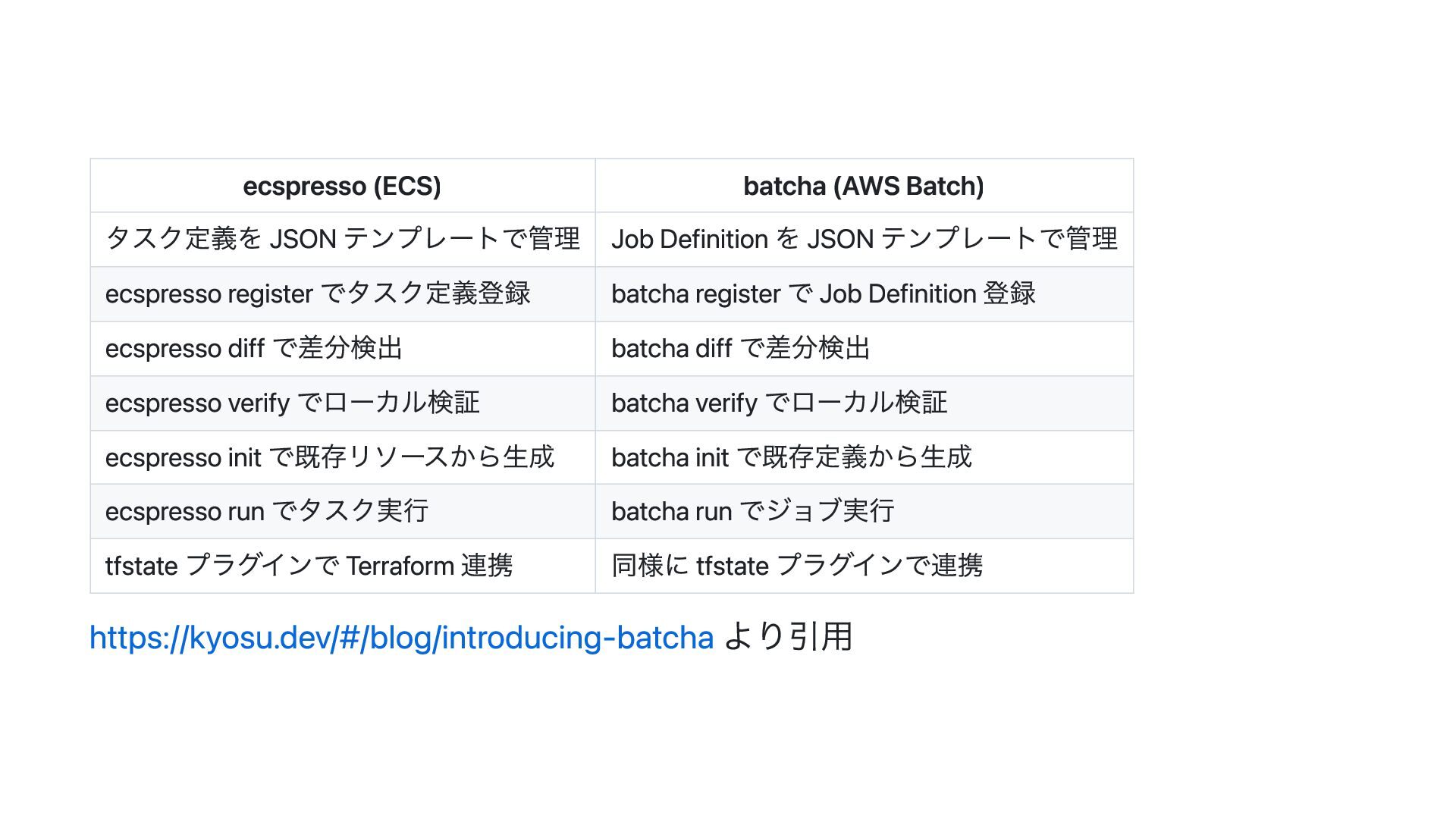 を JSON テンプレートで管理 ecspresso register でタスク定義登録 batcha register で Job Definition 登録 ecspresso diff で差分検出 batcha diff で差分検出 ecspresso verify でローカル検証 batcha verify でローカル検証 ecspresso init で既存リソースから生成 batcha init で既存定義から生成 ecspresso run でタスク実行 batcha run でジョブ実行 tfstate プラグインで Terraform 連携 同様に tfstate プラグインで連携 https://kyosu.dev/#/blog/introducing-batcha より引用
