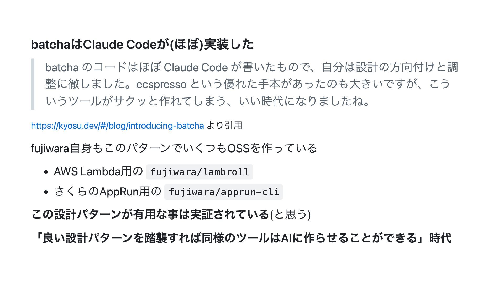 https://kyosu.dev/#/blog/introducing-batcha より引用 fujiwara自身もこのパターンでいくつもOSSを作っている AWS Lambda用の fujiwara/lambroll さくらのAppRun用の fujiwara/apprun-cli この設計パターンが有用な事は実証されている(と思う) 「良い設計パターンを踏襲すれば同様のツールはAIに作らせることができる」時代
