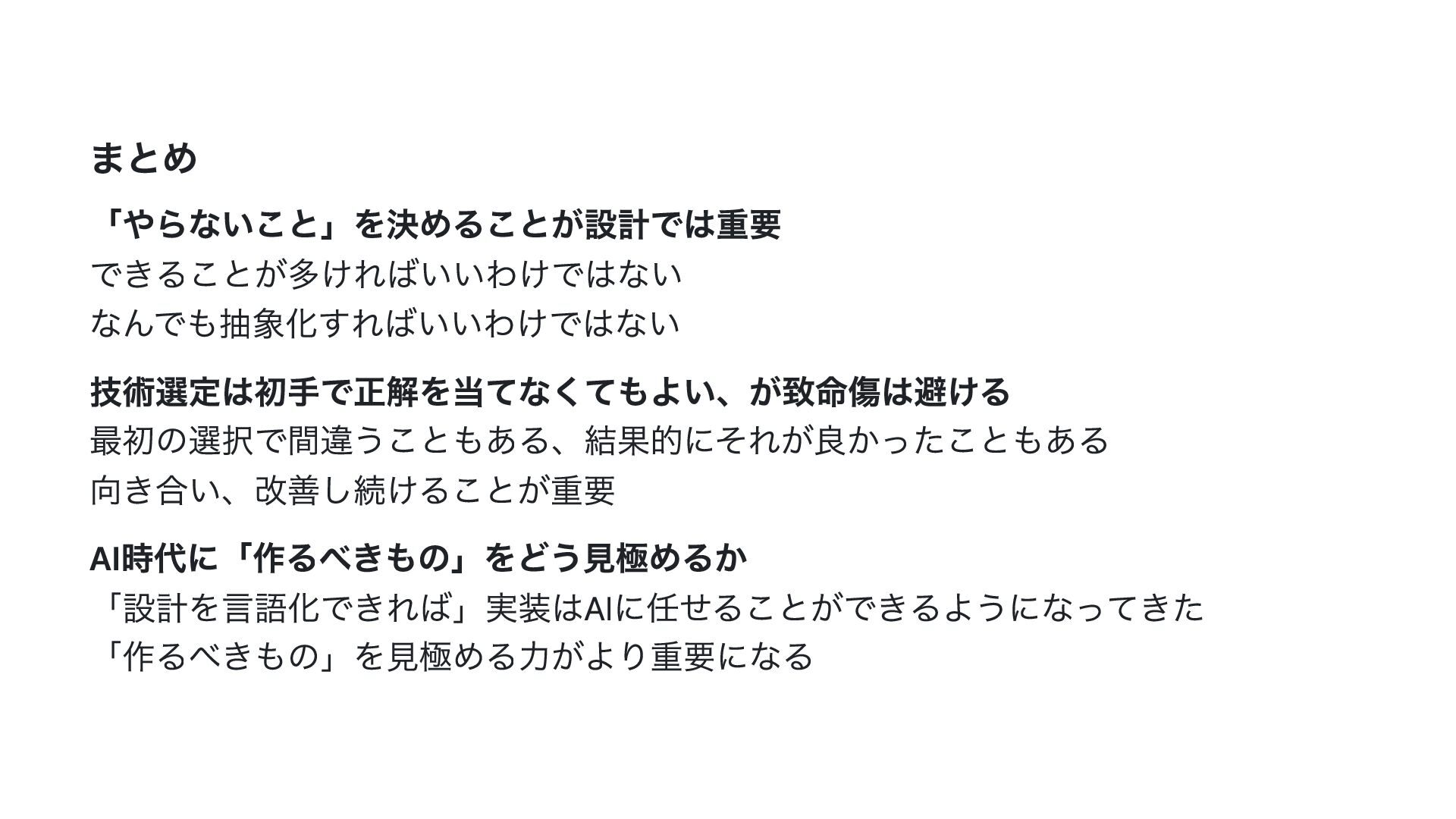 まとめ 「やらないこと」を決めることが設計では重要 できることが多ければいいわけではない なんでも抽象化すればいいわけではない 技術選定は初手で正解を当てなくてもよい、が致命傷は避ける 最初の選択で間違うこともある、結果的にそれが良かったこともある 向き合い、改善し続けることが重要 AI時代に「作るべきもの」をどう見極めるか 「設計を言語化できれば」実装はAIに任せることができるようになってきた 「作るべきもの」を見極める力がより重要になる