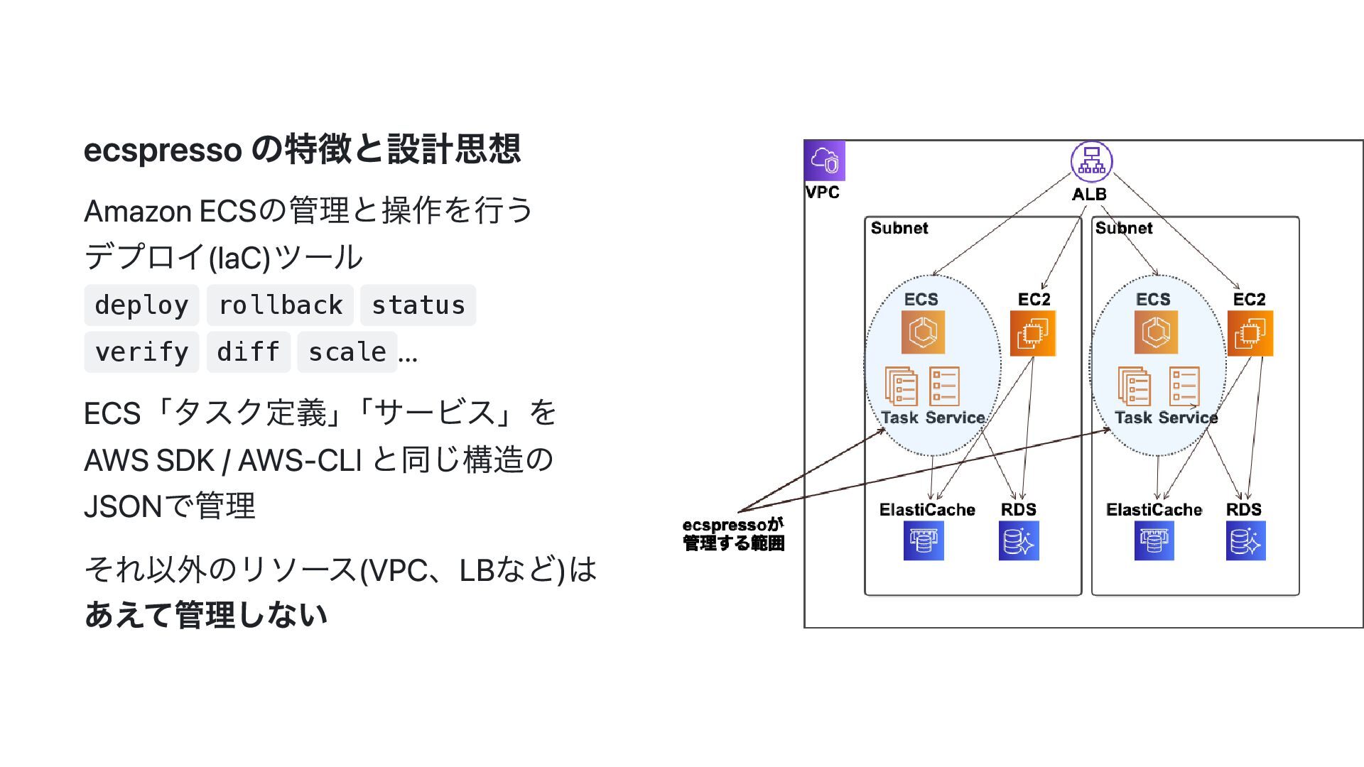 ecspresso の特徴と設計思想 Amazon ECSの管理と操作を行う デプロイ(IaC)ツール deploy rollback status verify diff