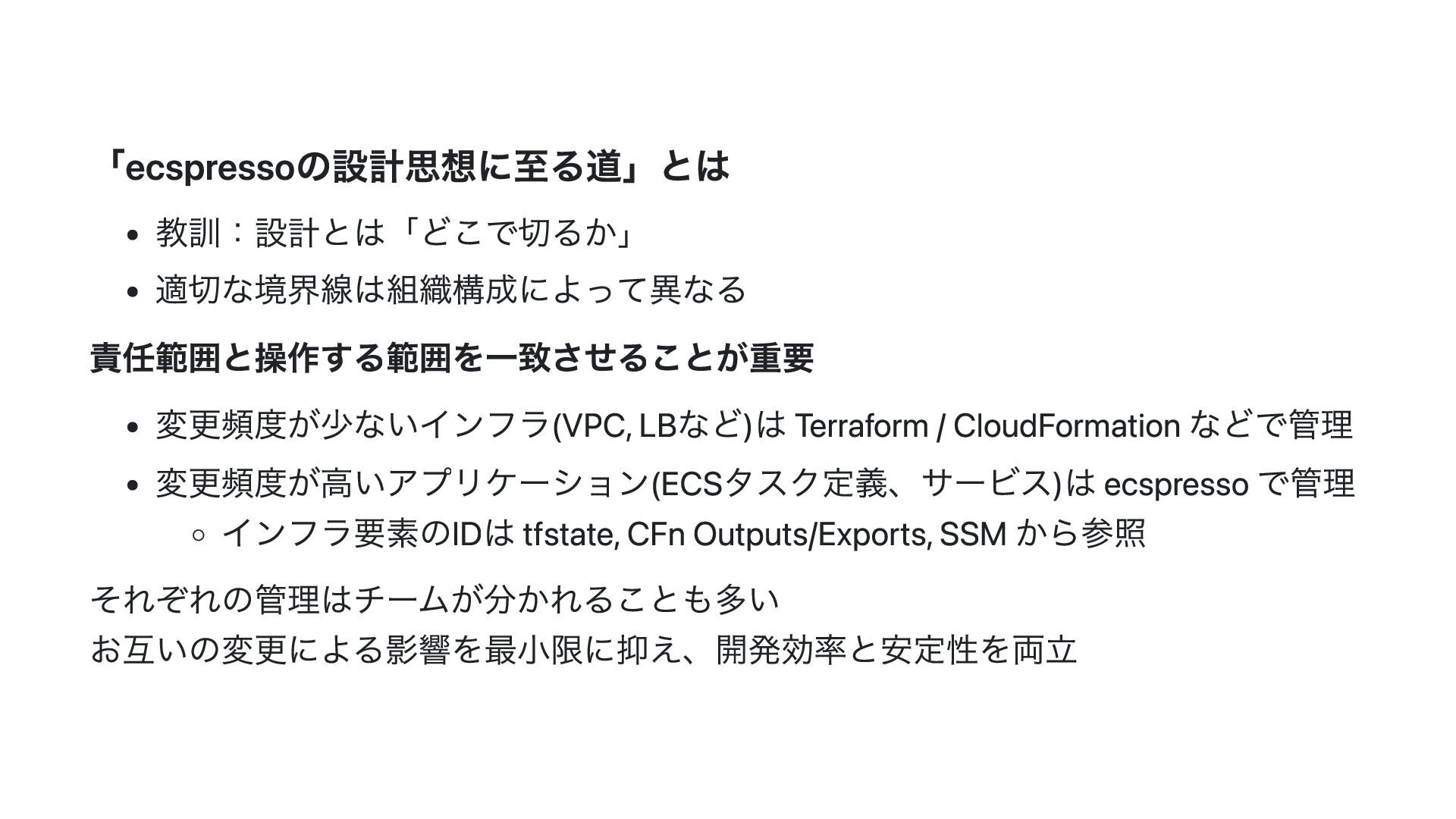 「ecspressoの設計思想に至る道」とは 教訓:設計とは「どこで切るか」 適切な境界線は組織構成によって異なる 責任範囲と操作する範囲を一致させることが重要 変更頻度が少ないインフラ(VPC, LBなど)は Terraform / CloudFormation などで管理