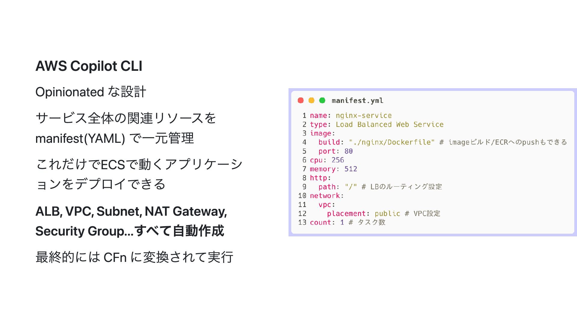 AWS Copilot CLI Opinionated な設計 サービス全体の関連リソースを manifest(YAML) で一元管理 これだけでECSで動くアプリケーシ ョンをデプロイできる