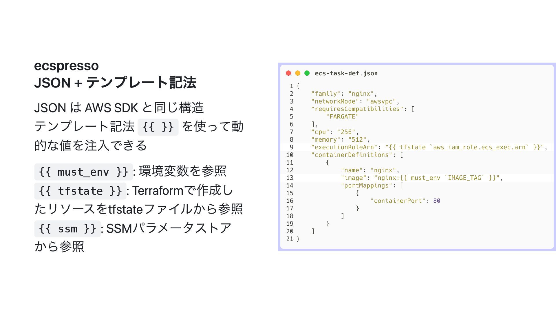ecspresso JSON + テンプレート記法 JSON は AWS SDK と同じ構造 テンプレート記法