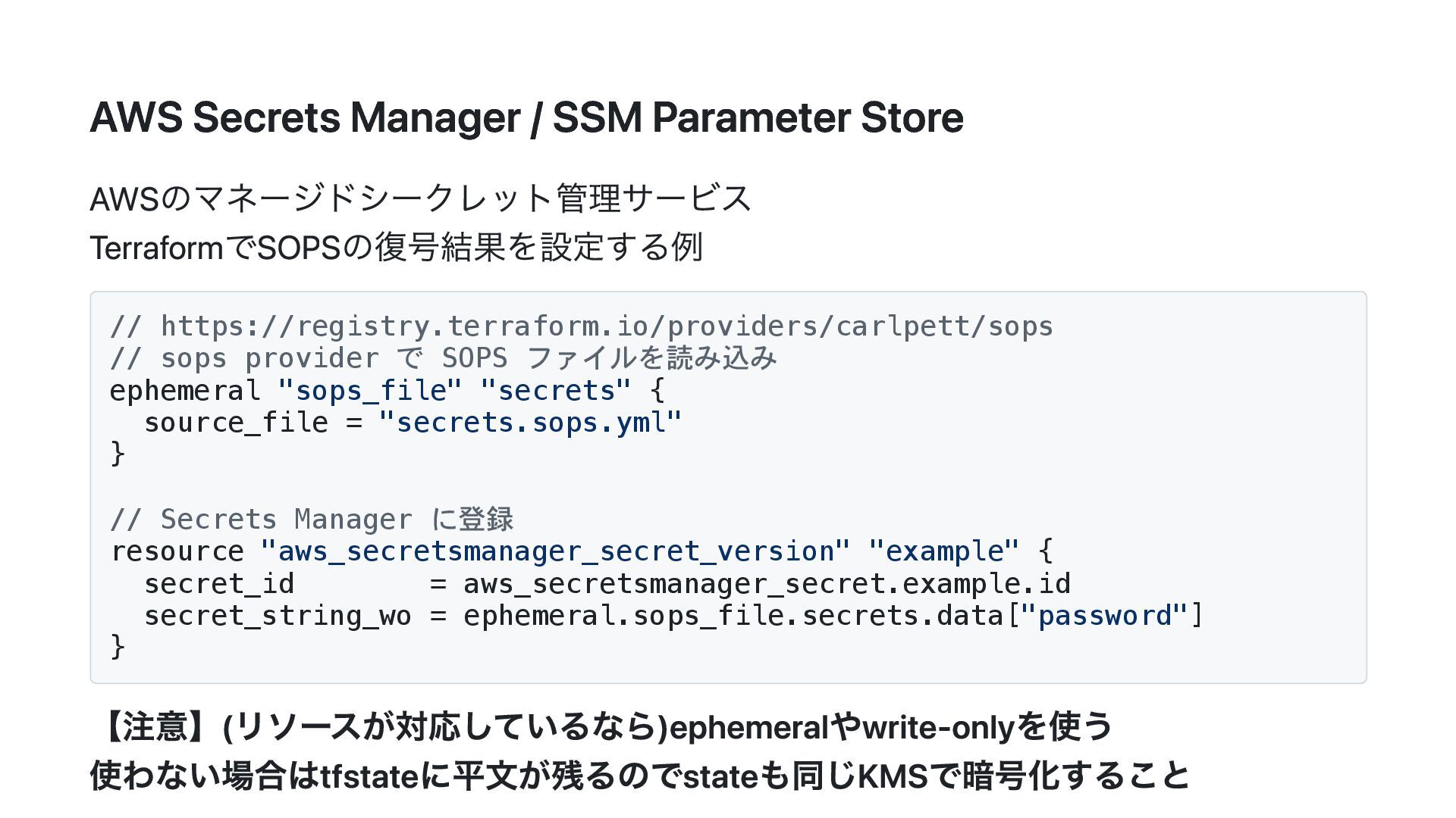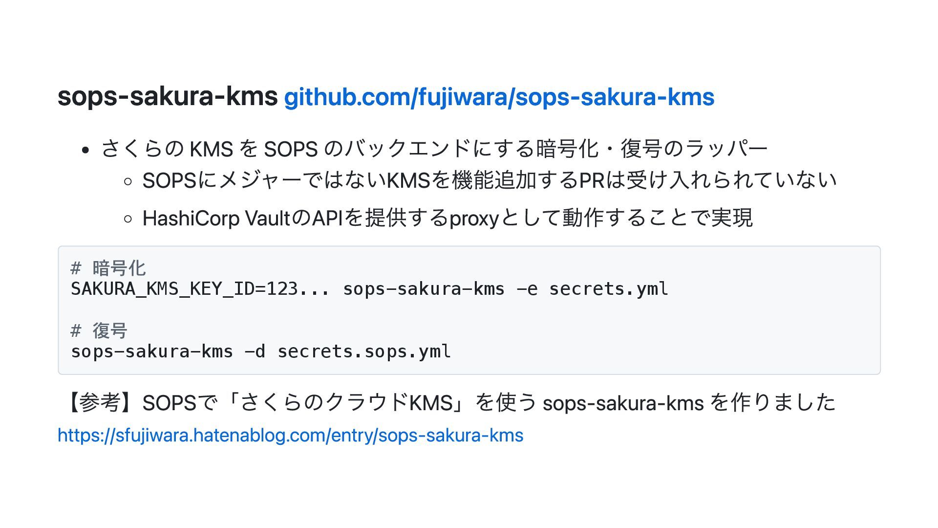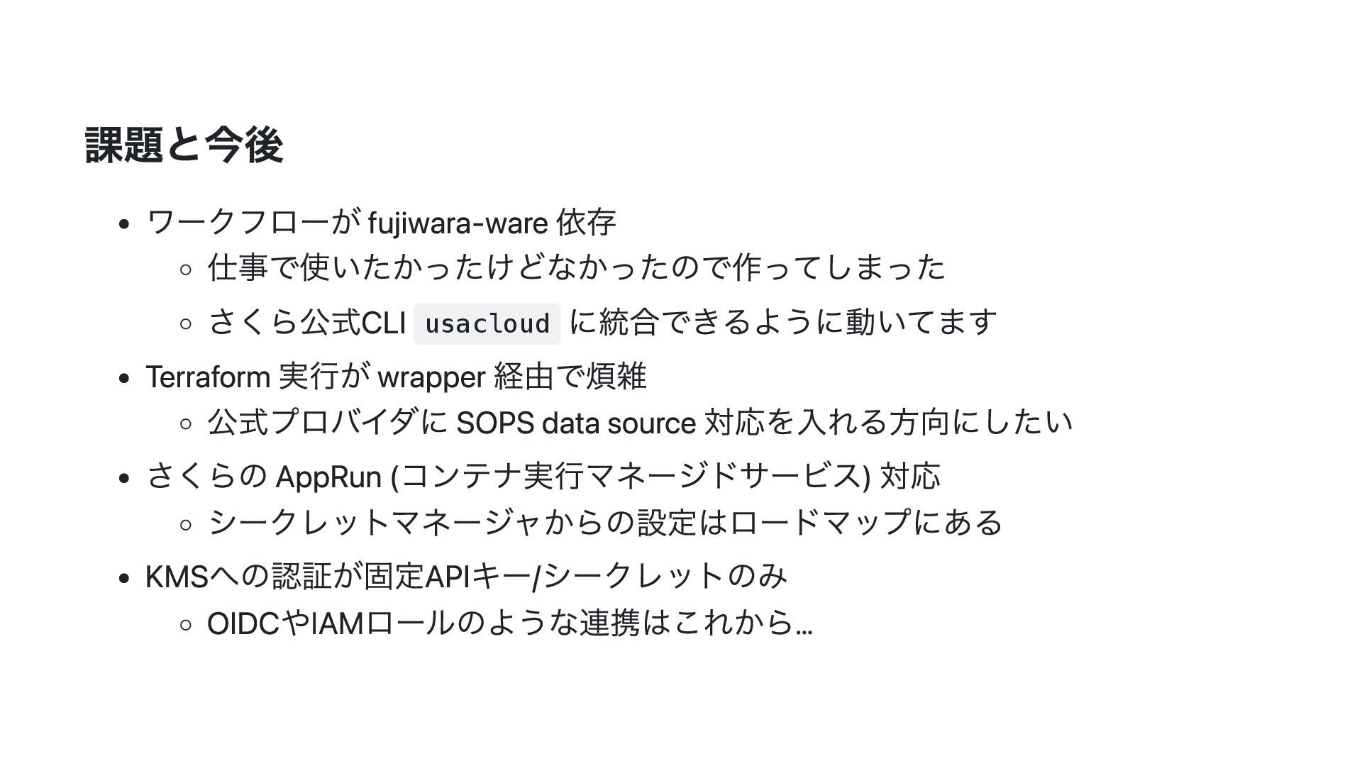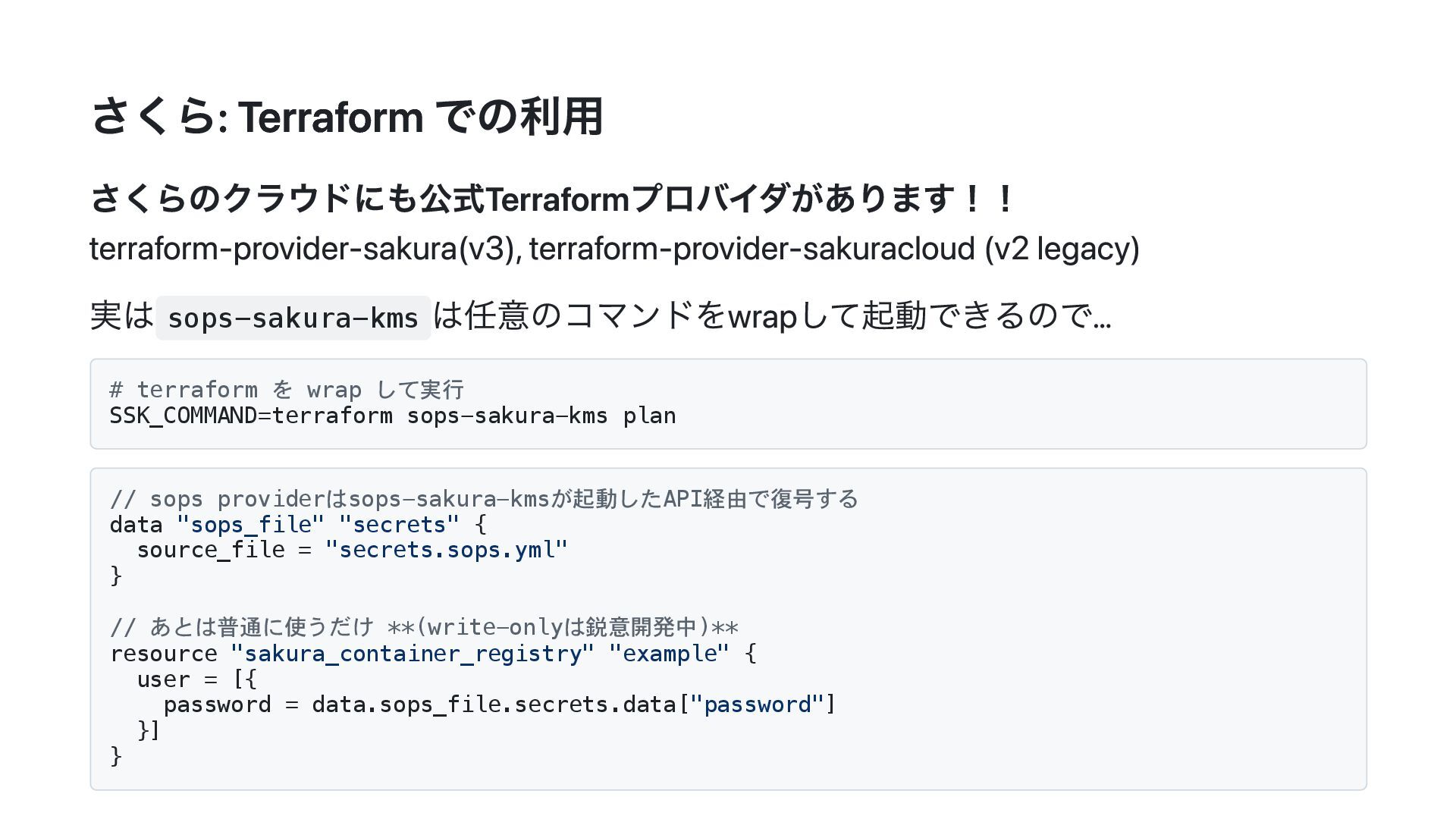 = sakura_kms.default.id } // 単一値の登録 resource "sakura_secret_manager_secret" "password" { name = "app" vault_id = sakura_secret_manager.default.id value = data.sops_file.secrets.data["password"] } // 複数の値をJSONでまとめて登録(レートリミット対策) resource "sakura_secret_manager_secret" "app" { name = "app" vault_id = sakura_secret_manager.default.id value = jsonencode({ for k, v in data.sops_file.secrets.data : k => v if startswith(k, "app.") }) }
