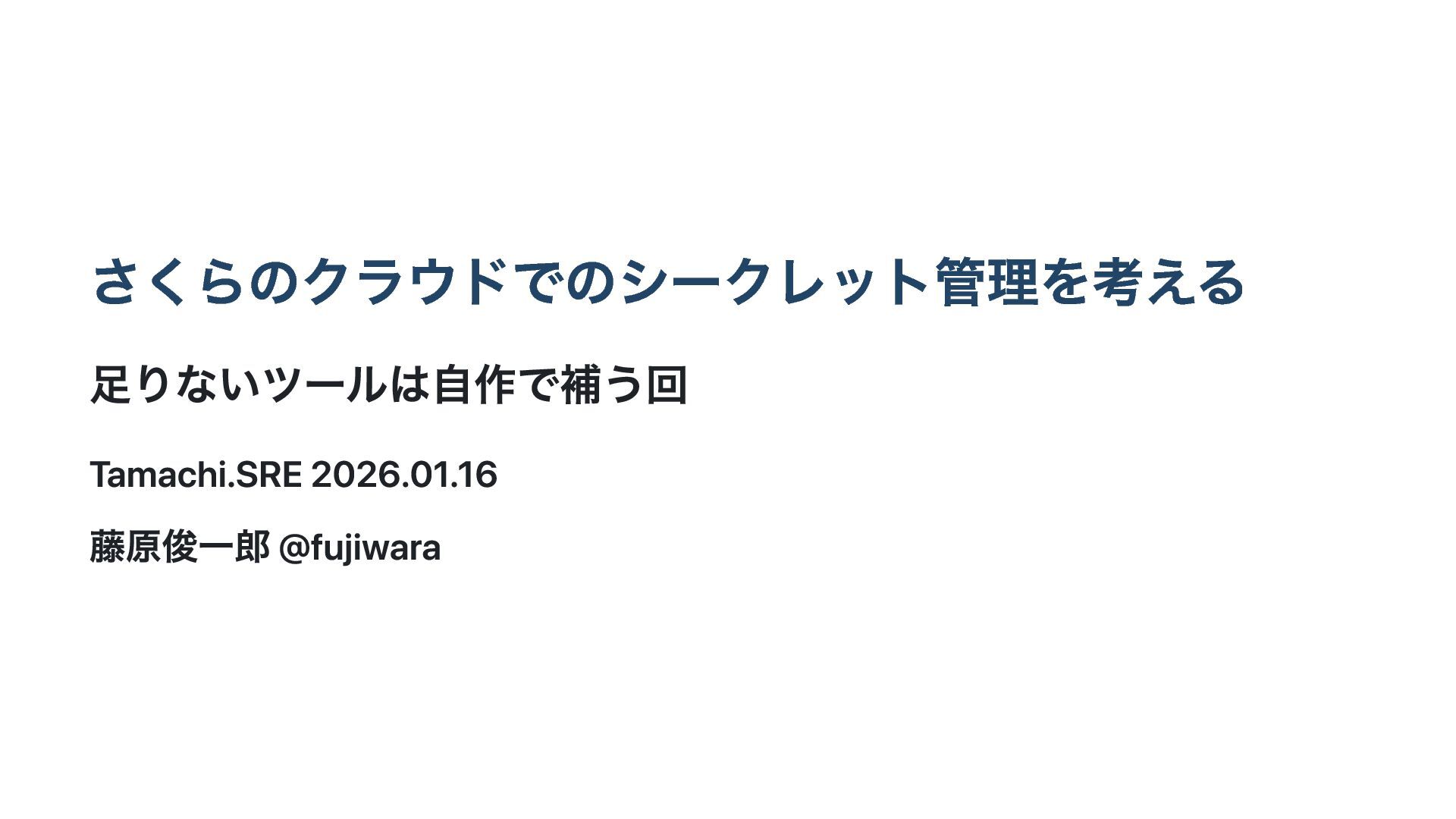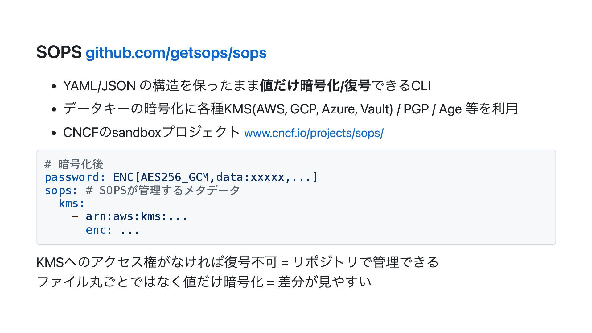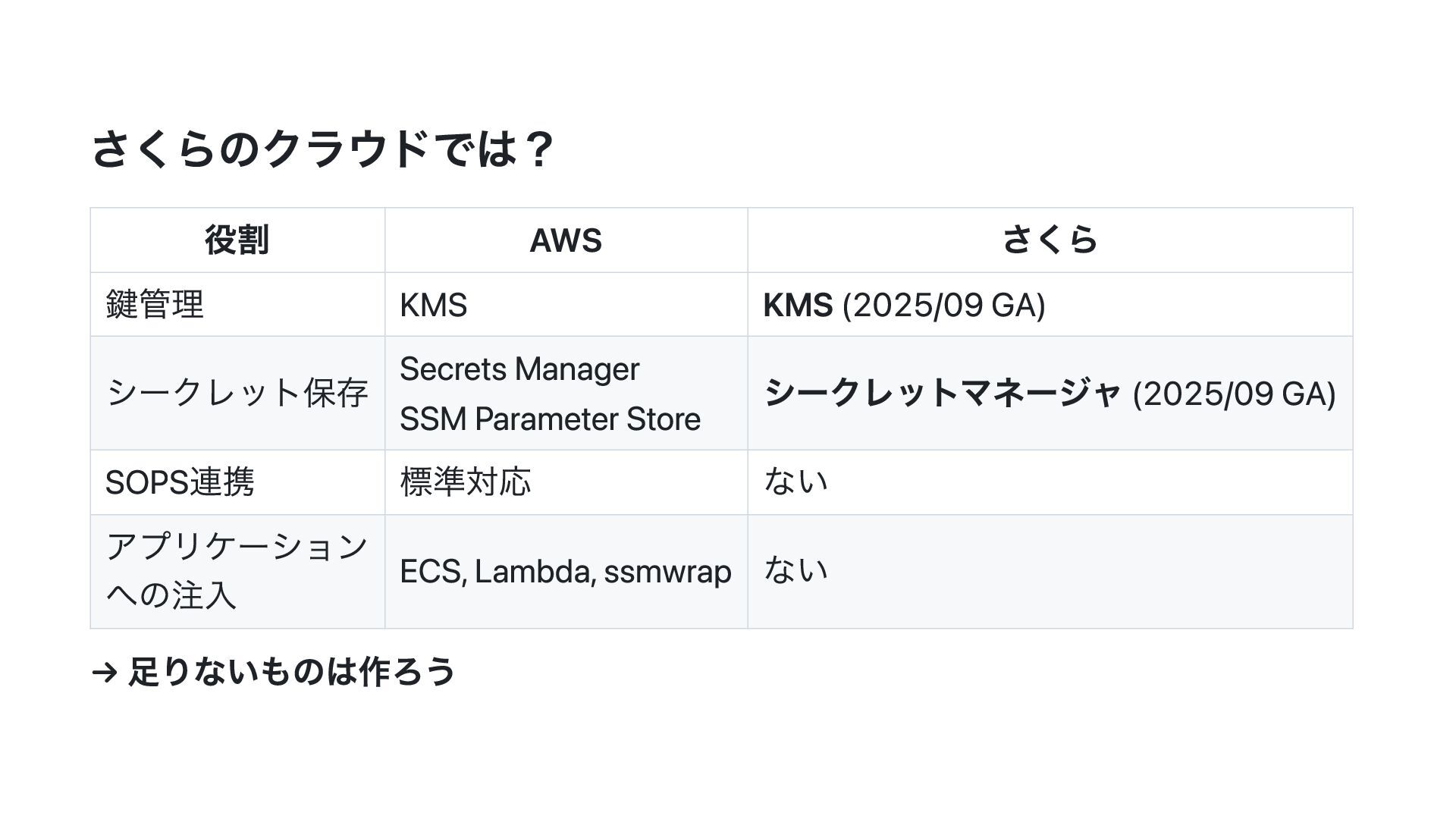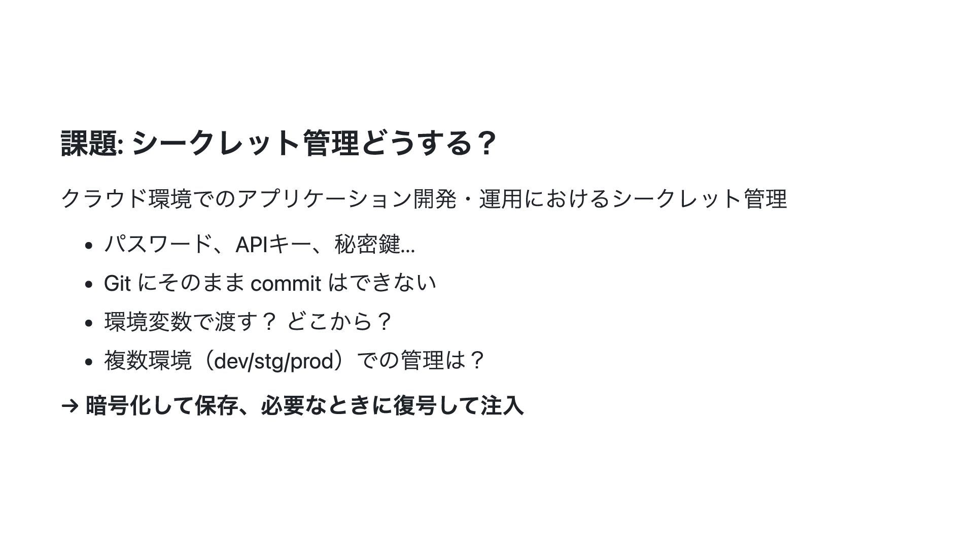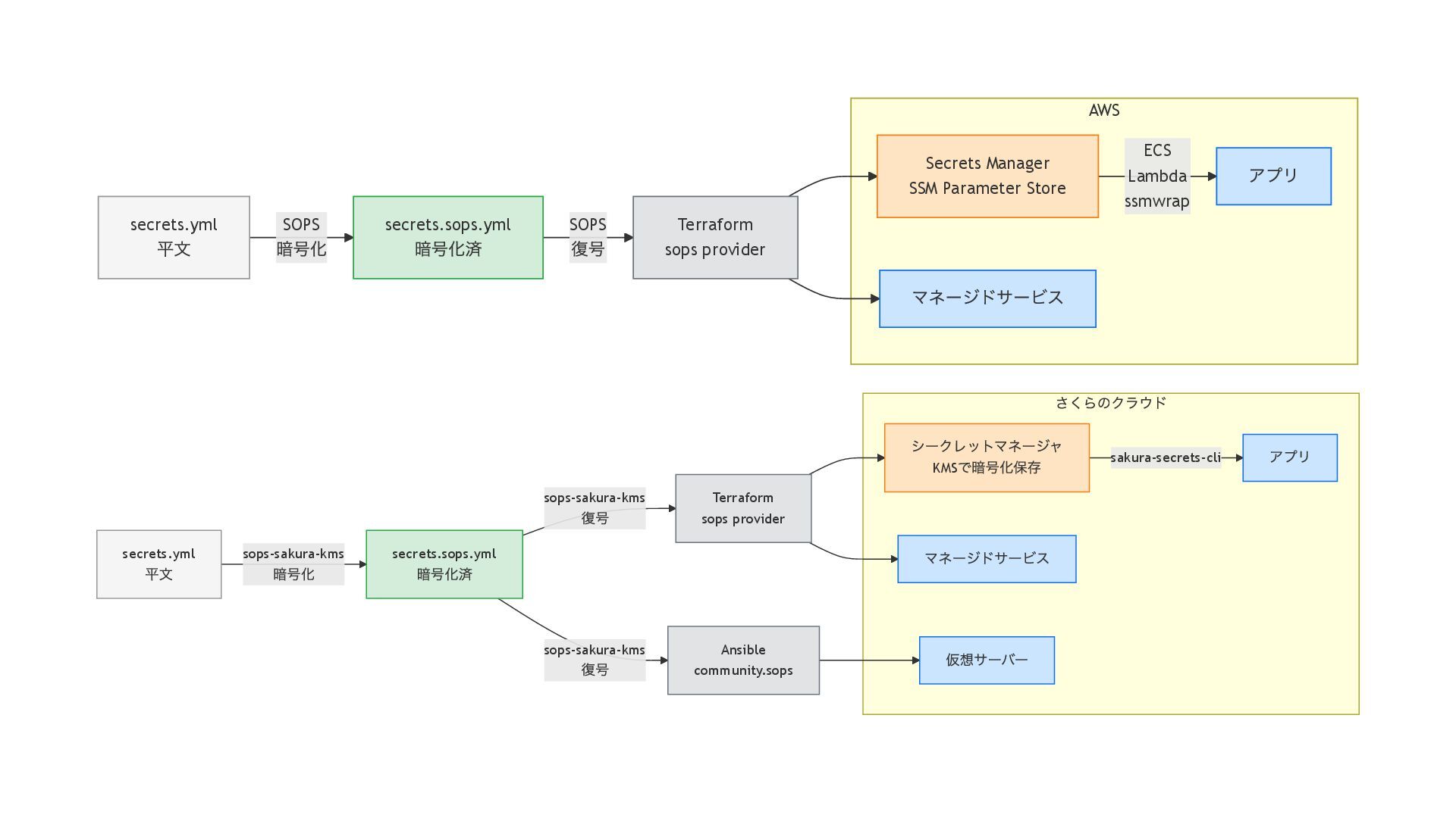 = sakura_kms.default.id } // 単一値の登録 resource "sakura_secret_manager_secret" "password" { name = "app" vault_id = sakura_secret_manager.default.id value = data.sops_file.secrets.data["password"] } // 複数の値をJSONでまとめて登録(レートリミット対策) resource "sakura_secret_manager_secret" "app" { name = "app" vault_id = sakura_secret_manager.default.id value = jsonencode({ for k, v in data.sops_file.secrets.data : k => v if startswith(k, "app.") }) }