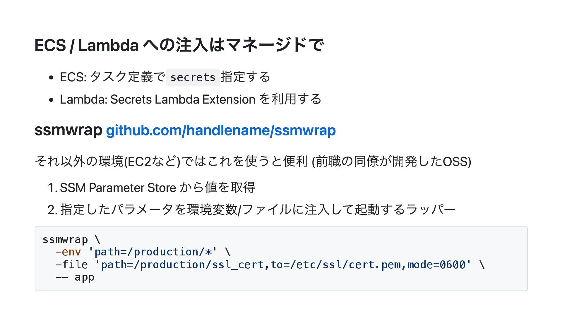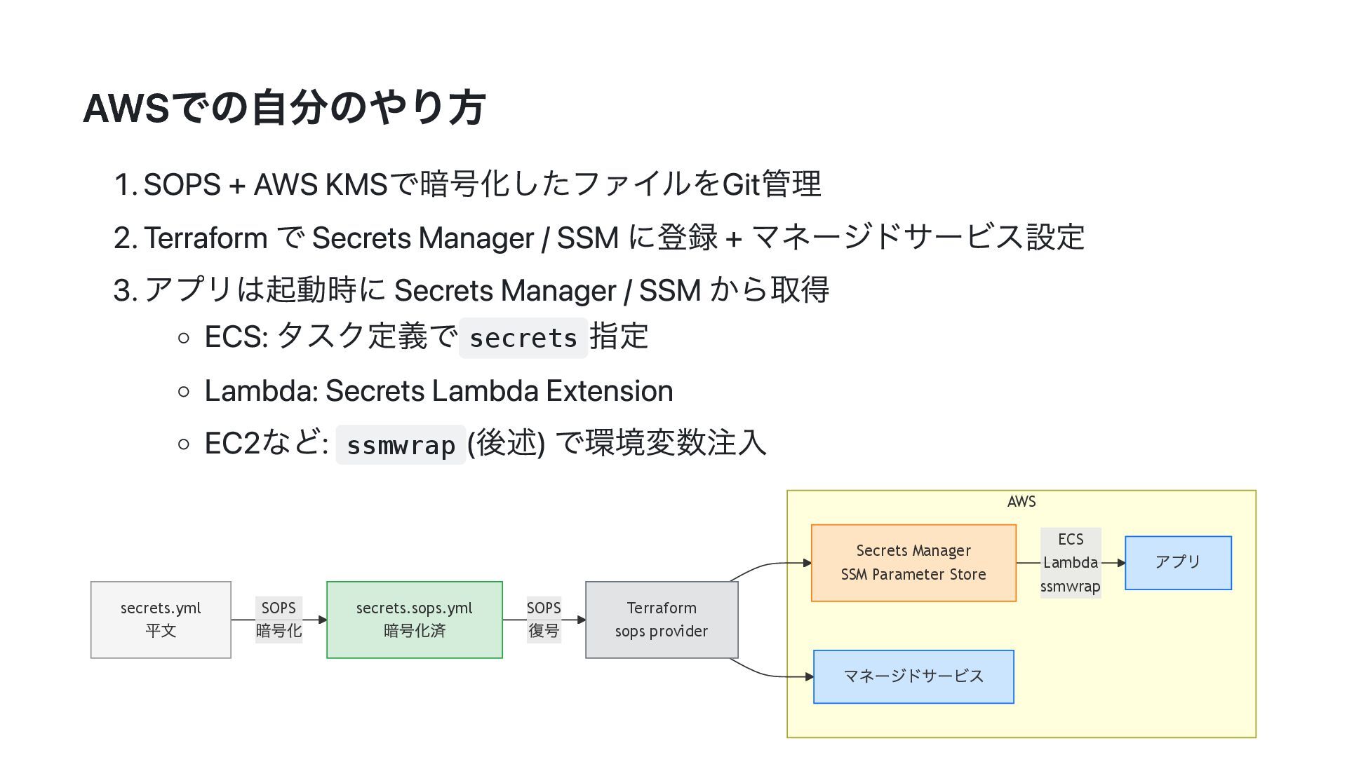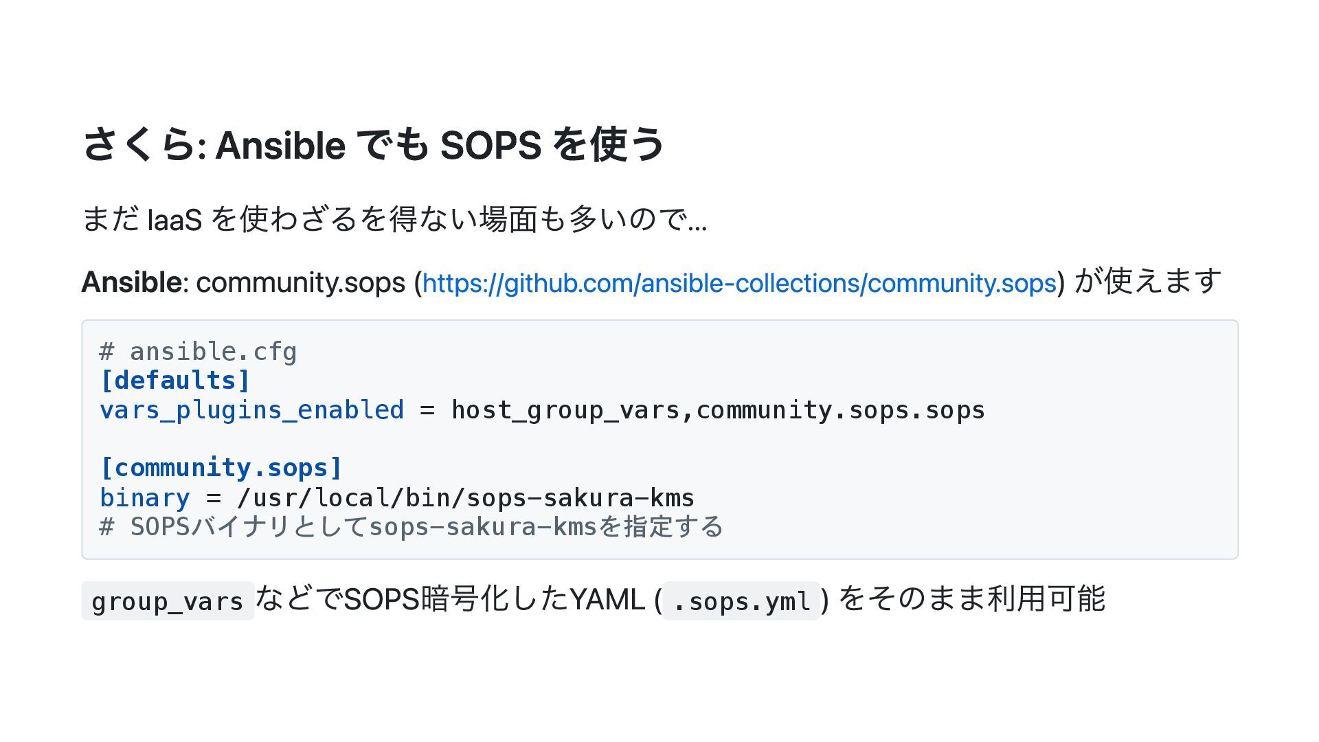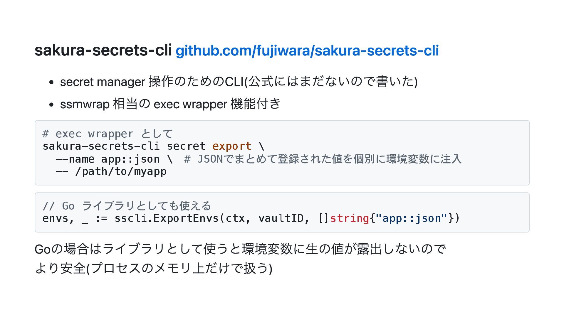 = sakura_kms.default.id } // 単一値の登録 resource "sakura_secret_manager_secret" "password" { name = "app" vault_id = sakura_secret_manager.default.id value = data.sops_file.secrets.data["password"] } // 複数の値をJSONでまとめて登録(レートリミット対策) resource "sakura_secret_manager_secret" "app" { name = "app" vault_id = sakura_secret_manager.default.id value = jsonencode({ for k, v in data.sops_file.secrets.data : k => v if startswith(k, "app.") }) }