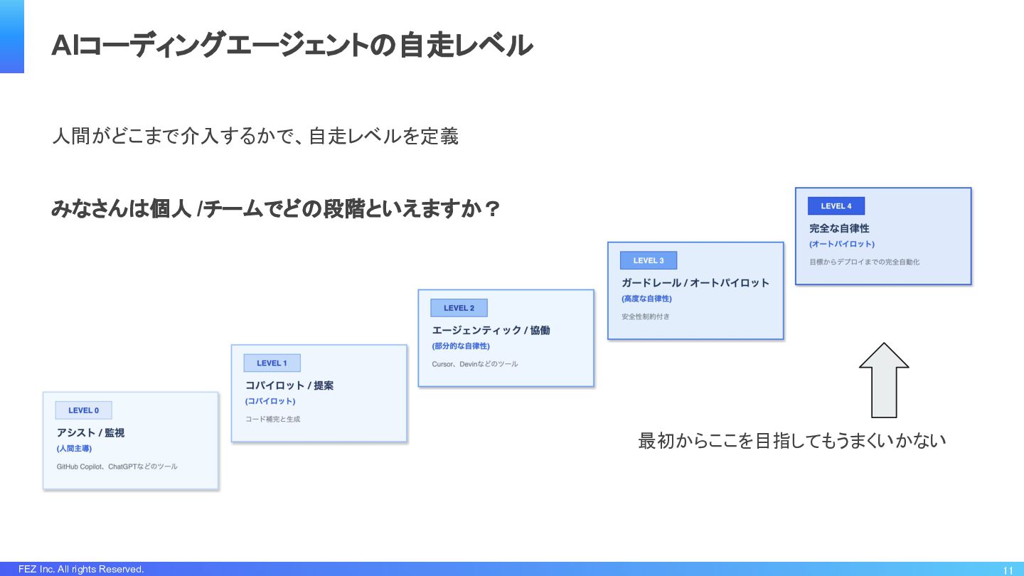 FEZ Inc. All rights Reserved. 人間がどこまで介入するかで、自走レベルを定義 みなさんは個人 /チームでどの段階といえますか? 11 AIコーディングエージェントの自走レベル