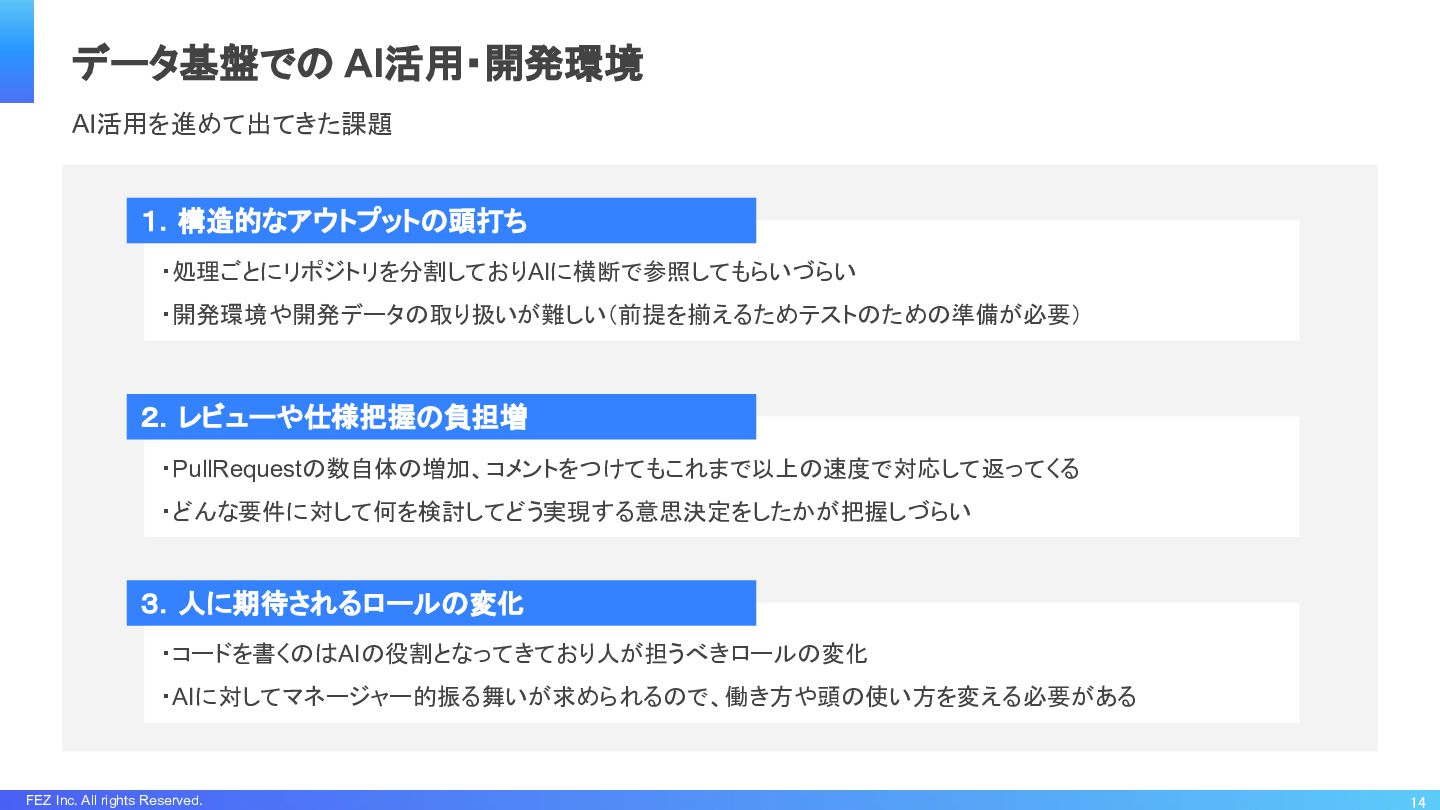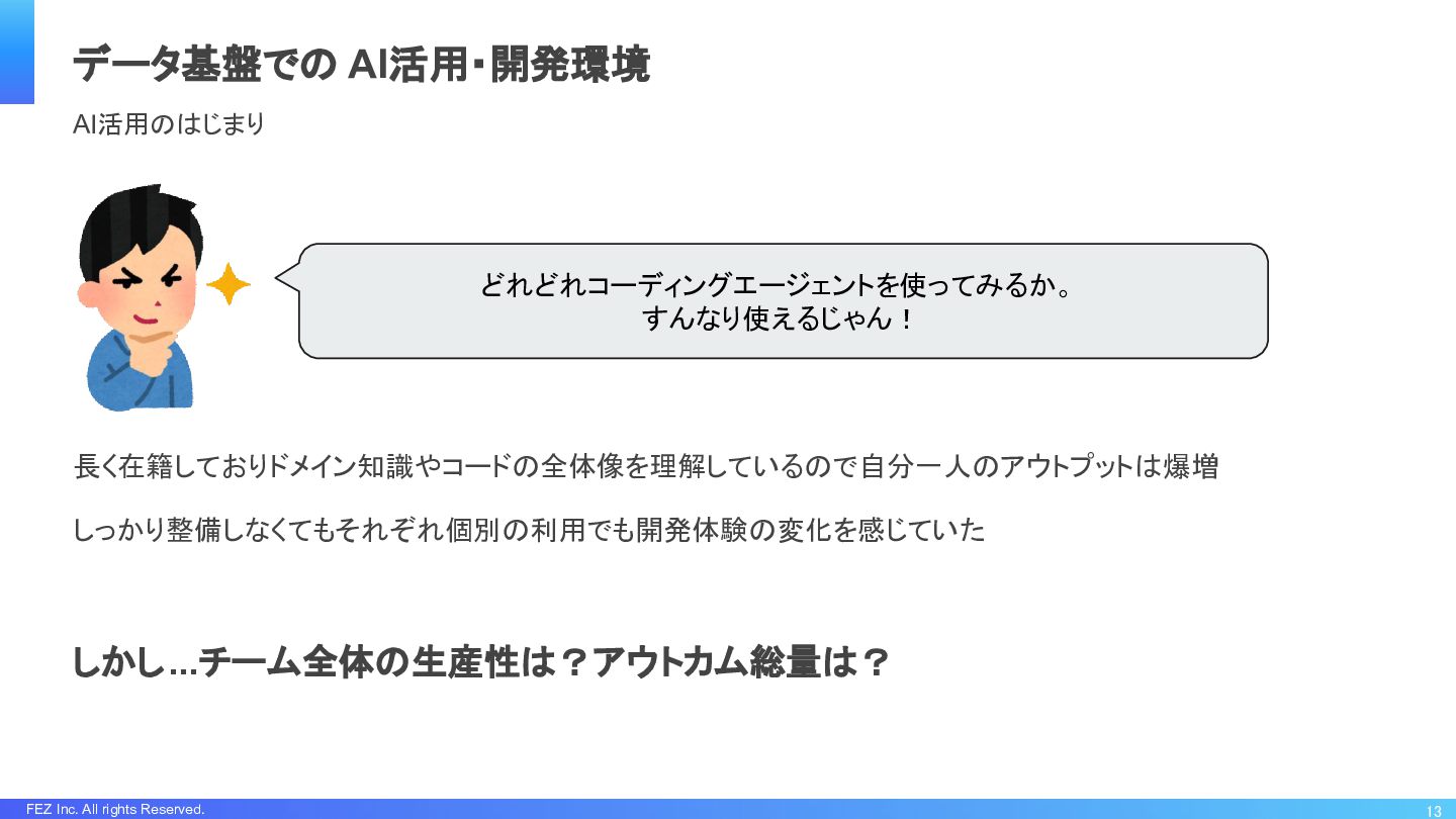 FEZ Inc. All rights Reserved. 長く在籍しておりドメイン知識やコードの全体像を理解しているので自分一人のアウトプットは爆増 しっかり整備しなくてもそれぞれ個別の利用でも開発体験の変化を感じていた しかし...チーム全体の生産性は?アウトカム総量は? 13 データ基盤での