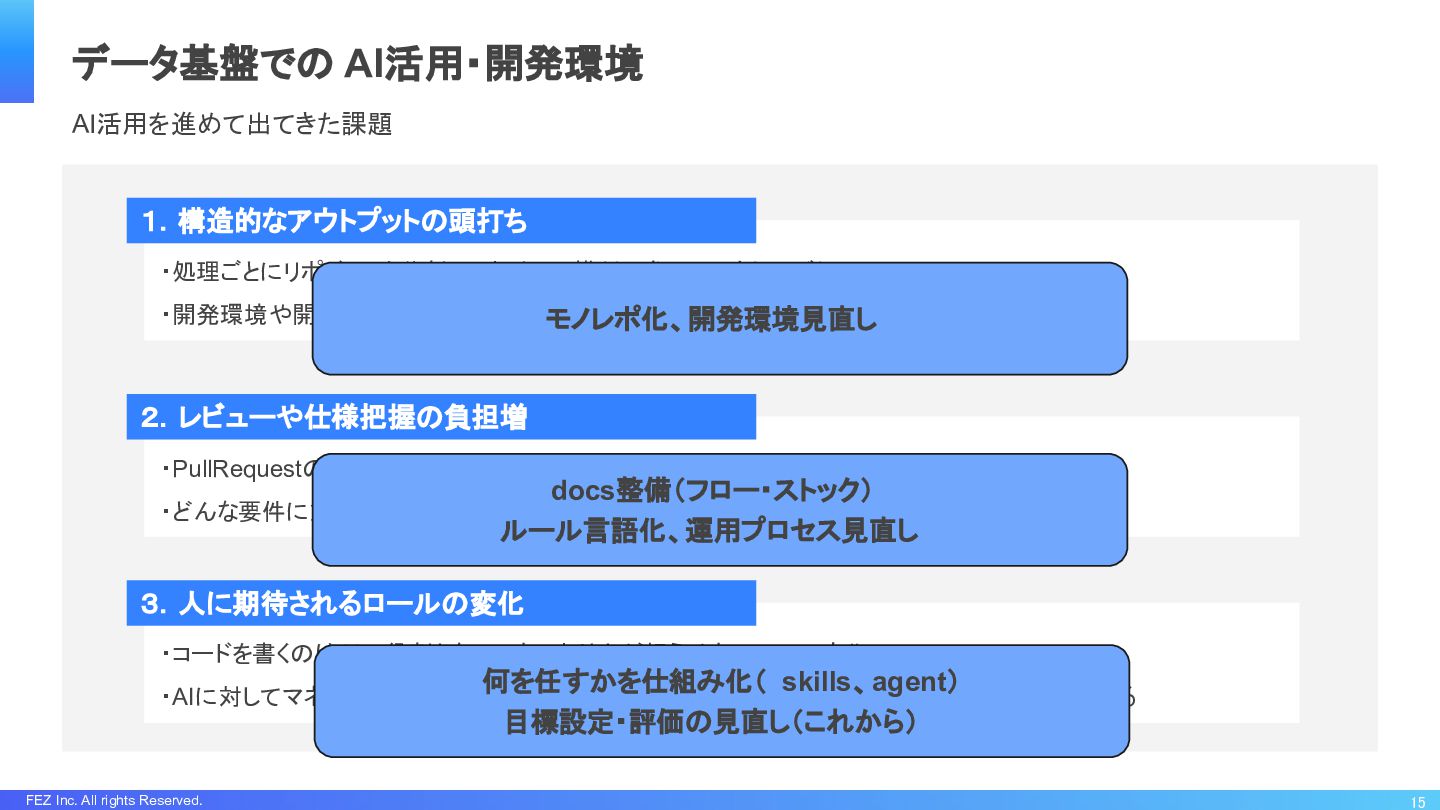 FEZ Inc. All rights Reserved. データ基盤での AI活用・開発環境 14 ・処理ごとにリポジトリを分割しておりAIに横断で参照してもらいづらい ・開発環境や開発データの取り扱いが難しい(前提を揃えるためテストのための準備が必要)