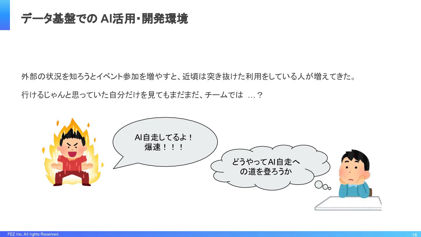 FEZ Inc. All rights Reserved. 外部の状況を知ろうとイベント参加を増やすと、近頃は突き抜けた利用をしている人が増えてきた。 行けるじゃんと思っていた自分だけを見てもまだまだ、チームでは …? 16 データ基盤での