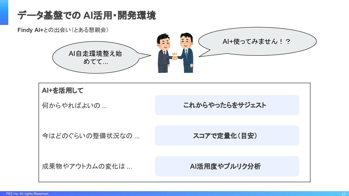 FEZ Inc. All rights Reserved. 17 データ基盤での AI活用・開発環境 Findy AI+との出会い(とある懇親会)