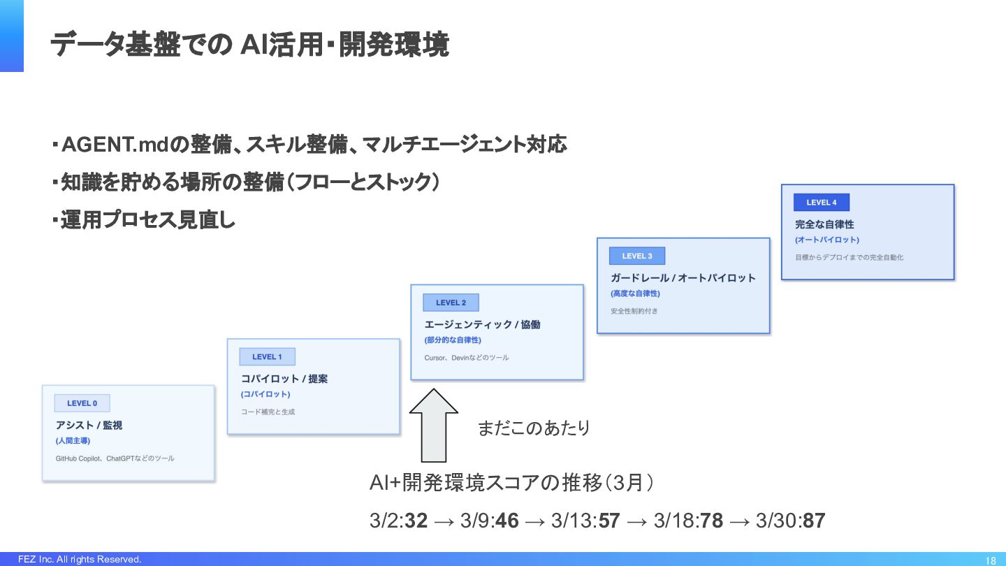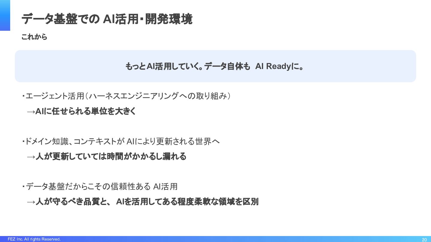 FEZ Inc. All rights Reserved. ・AGENT.mdの整備、スキル整備、マルチエージェント対応 ・知識を貯める場所の整備(フローとストック) ・運用プロセス見直し 18 データ基盤での