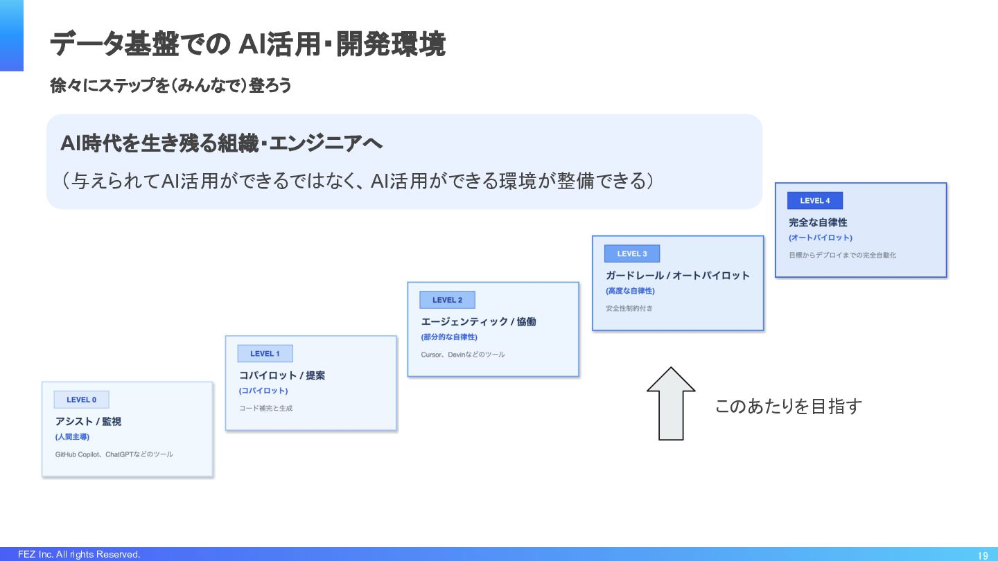 FEZ Inc. All rights Reserved. 19 データ基盤での AI活用・開発環境 このあたりを目指す 徐々にステップを(みんなで)登ろう