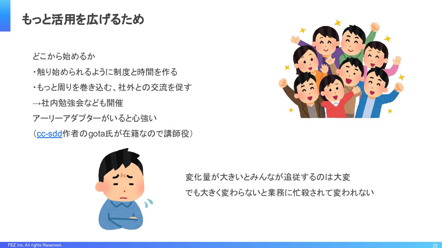 (cc-sdd作者のgota氏が在籍なので講師役) 22 もっと活用を広げるため 変化量が大きいとみんなが追従するのは大変 でも大きく変わらないと業務に忙殺されて変われない