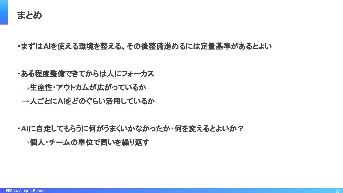 FEZ Inc. All rights Reserved. ・まずはAIを使える環境を整える、その後整備進めるには定量基準があるとよい ・ある程度整備できてからは人にフォーカス →生産性・アウトカムが広がっているか →人ごとにAIをどのぐらい活用しているか ・AIに自走してもらうに何がうまくいかなかったか・何を変えるとよいか?
