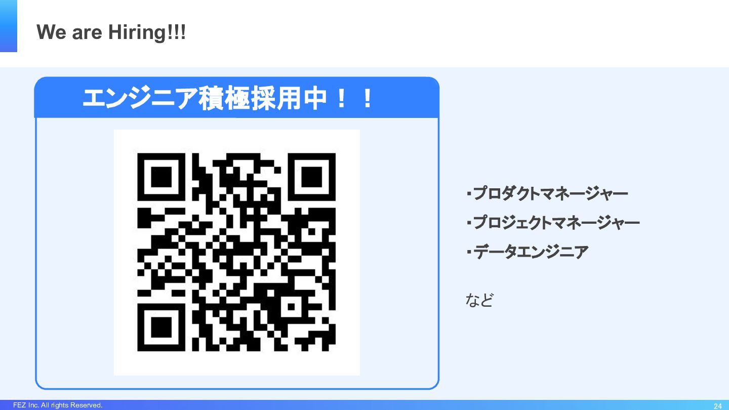 FEZ Inc. All rights Reserved. 24 We are Hiring!!! エンジニア積極採用中!!