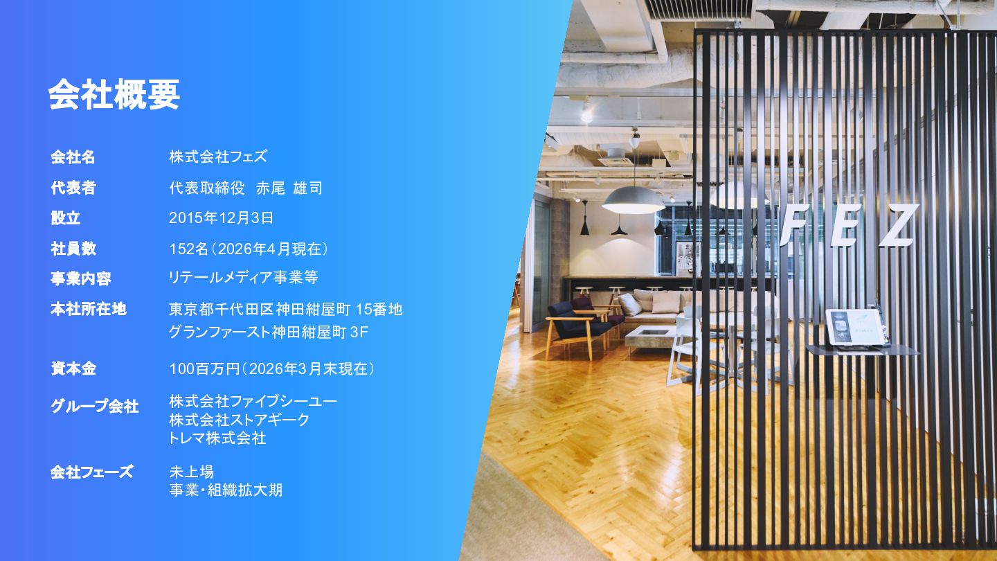 会社名 株式会社フェズ 代表者 代表取締役 赤尾 雄司 設立 2015年12月3日 社員数 152名(2026年4月現在) 本社所在地
