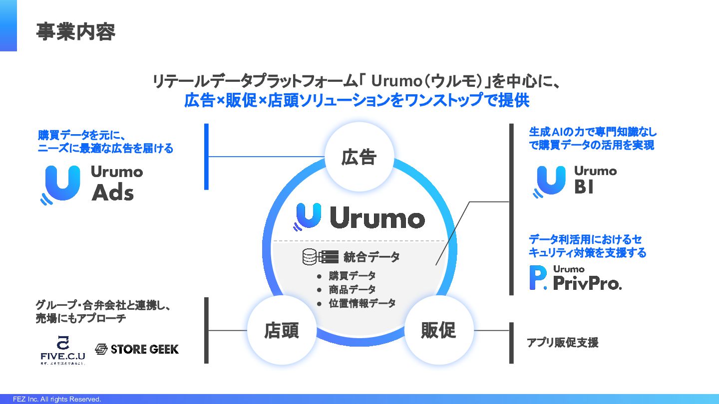 FEZ Inc. All rights Reserved. 事業内容 リテールデータプラットフォーム「 Urumo(ウルモ)」を中心に、 広告×販促×店頭ソリューションをワンストップで提供 •
