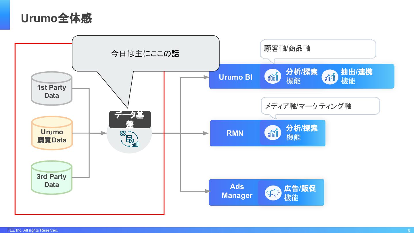 3rd Party Data データ基 盤 Urumo 購買Data Ads Manager 広告/販促 機能 分析/探索 機能 RMN 分析/探索 機能 Urumo BI 抽出/連携 機能 顧客軸/商品軸 メディア軸/マーケティング軸 今日は主にここの話