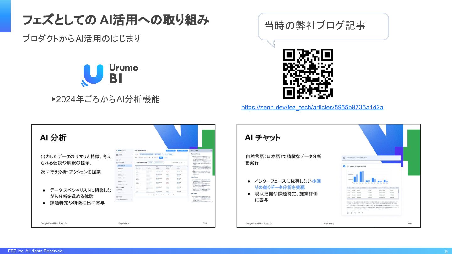 FEZ Inc. All rights Reserved. ▶2024年ごろからAI分析機能 9 フェズとしての AI活用への取り組み https://zenn.dev/fez_tech/articles/5955b9735a1d2a