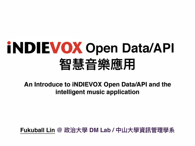 2. 好,那跟各位介紹一下我自己,我是林志傑,網路上常用的名字是 Fukuball,所以各位可以用 Fukuball 這個關鍵字找到我。我目前在 iNDIEVOX 獨立音樂網工作,而今天的主題也就是我在 iNDIEVOX 工作時做的一些音樂分析實驗,應該對各位的研究也會有些幫助。
