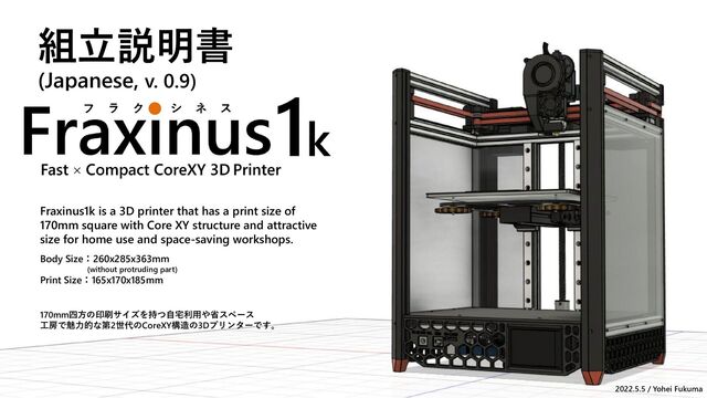 Fraxinus(フラクシネス)は自宅利用や省スペース工房で魅力的な3Dプリンターです。コンパクトでありながらCoreXY構造が持つ高速動作を実現しています。2022.06現在、印刷サイズは170mm角と220mm角の2機種を展開しています。
