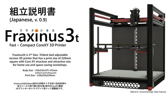 Fraxinus3eはEnder3V2やその互換機をアップサイクルして作製出来る3Dプリンターで、高速動作が可能で□220mm程度の印刷サイズです。