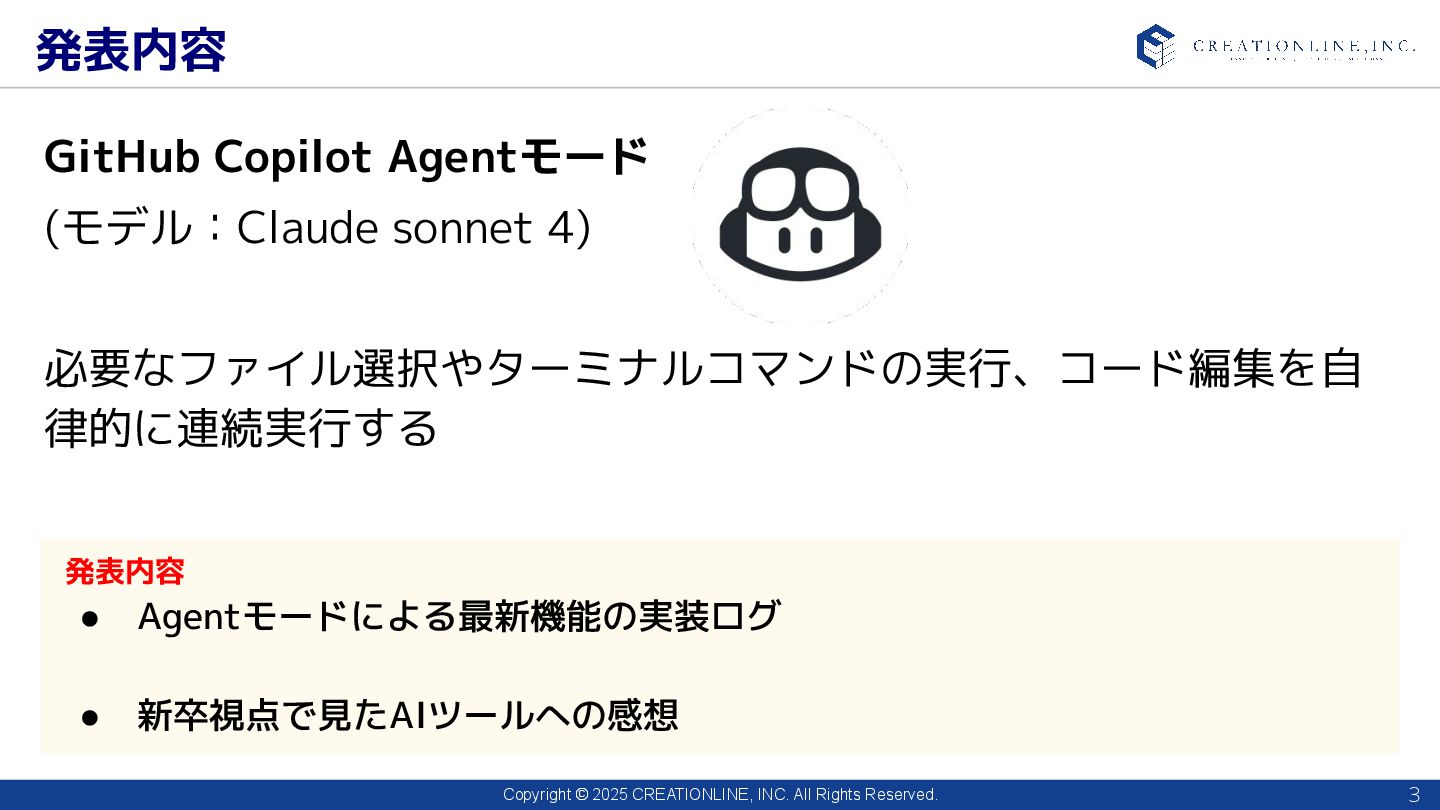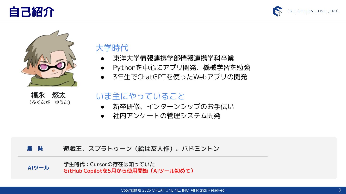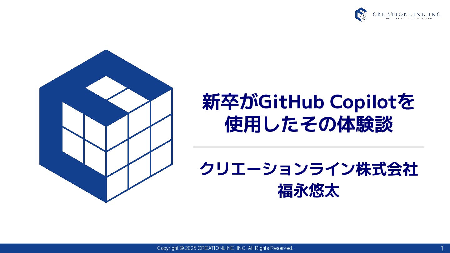 1. Copyright © 2025 CREATIONLINE, INC. All Rights Reserved. 新卒がGitHub Copilotを