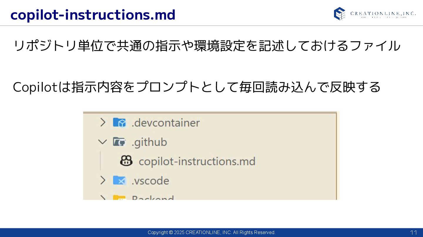 2025 CREATIONLINE, INC. All Rights Reserved. copilot-instructions.md 11 リポジトリ単位で共通の指示や環境設定を記述しておけるファイル Copilotは指示内容をプロンプトとして毎回読み込んで反映する
